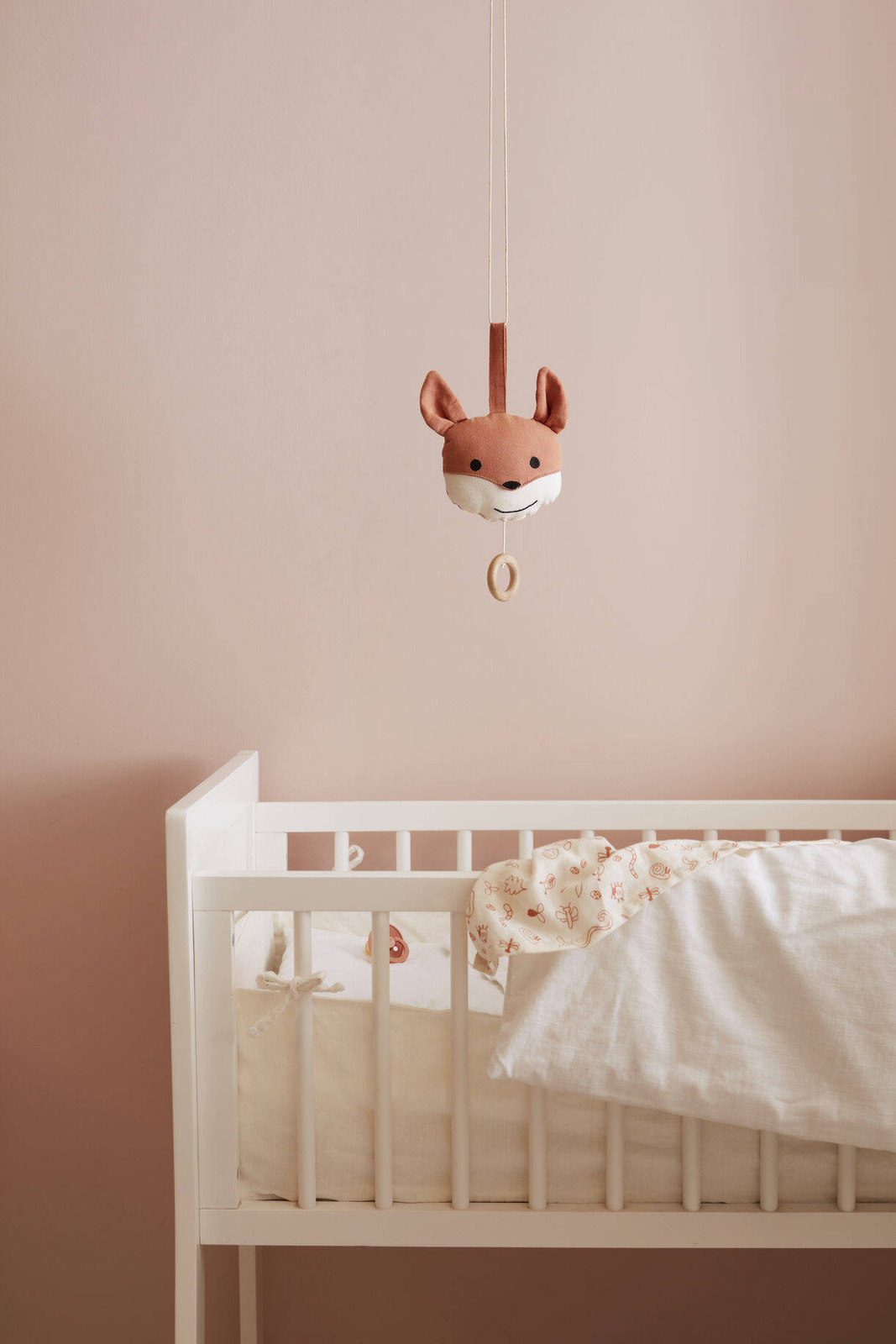 Pociągnij za drewniany uchwyt, a łoś Bo zagra uspokajającą melodię dla Twojego dziecka. Słuchanie tej samej melodii sprawia, że maluszek czuje się bezpieczny. Dzięki wieszaczkowi z rzepem możesz zabrać i zawiesić pozytywkę, gdzie tylko chcesz. Zabaw swojego maluszka w trakcie przewijania. Pozytywkę należy czyścić wilgotną szmatką lub odkurzając tkaninę. Ponieważ pozytywka zawiera elementy mechaniczne, zabawki nie można prać w pralce ani zamoczyć.