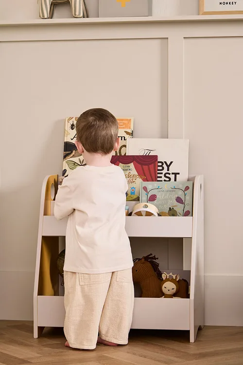Dolna część regału jest idealna do przechowywania pluszowych zabawek, ulubionych przytulanek i klocków maluszka, a górna część regału - półki - to świetne miejsce na pochwalenie się ulubionymi książkami.