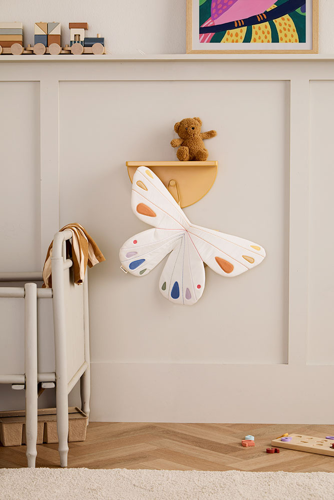 - Skrzydła motyla z bawełny organicznej w odcieniach zieleni i wielobarwnych haftów. Elastyczne szelki pozwalają dziecku łatwo je założyć i rozpocząć zabawę.