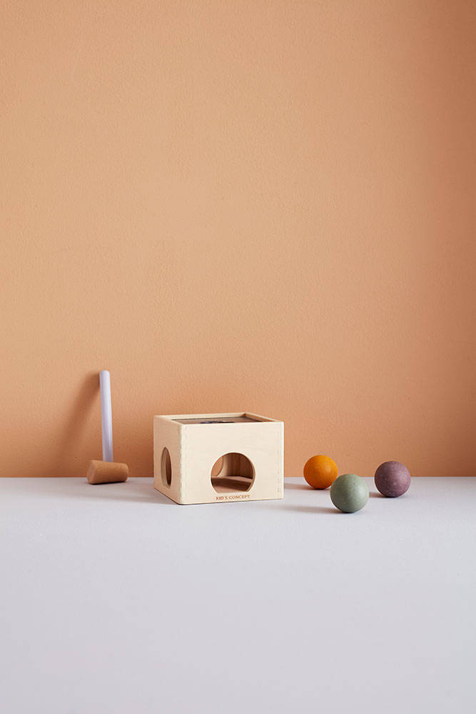 Umieść drewnianą kulkę w otworze w pudełku i uderz młotkiem, aby wpadła do środka. Bam, bam, bam, uważaj! Nigdy nie wiadomo, z której strony wypadnie kulka. Zestaw zawiera trzy bejcowane drewniane kulki w różnych kolorach i młotek.
