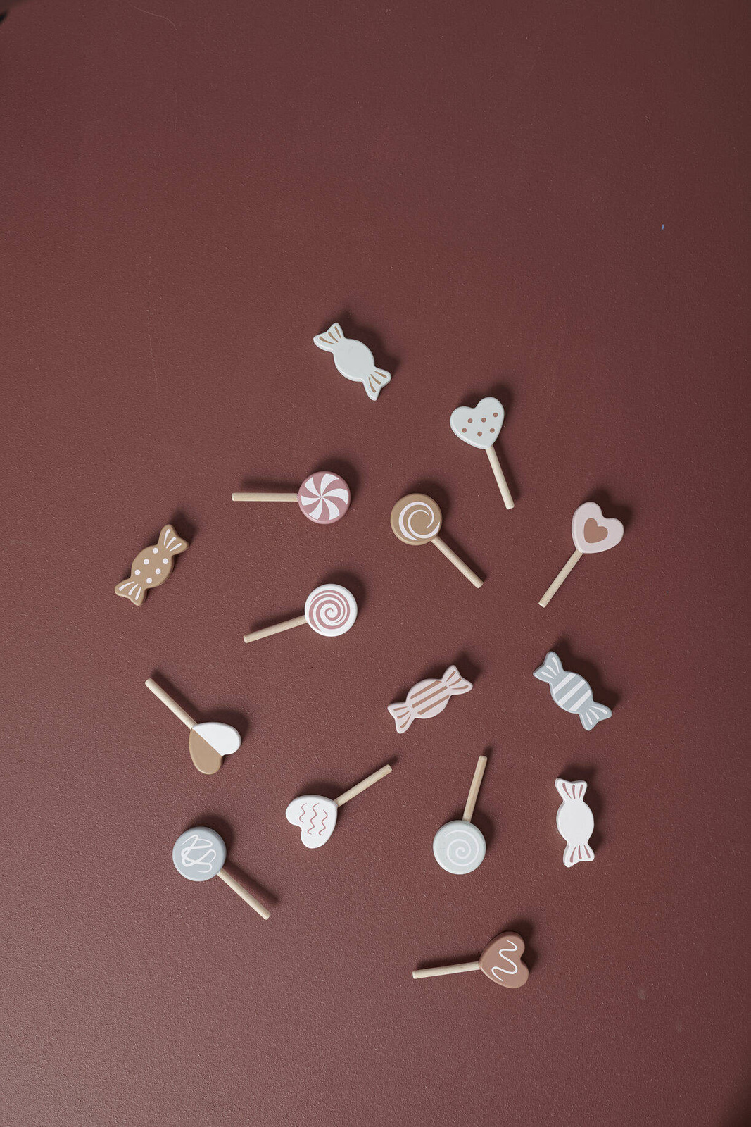 Cukierki do zabawy, wykonane z drewna. Zestaw zawiera 15 cukierków i torbę do przechowywania o wymiarach 15 x 20 cm.