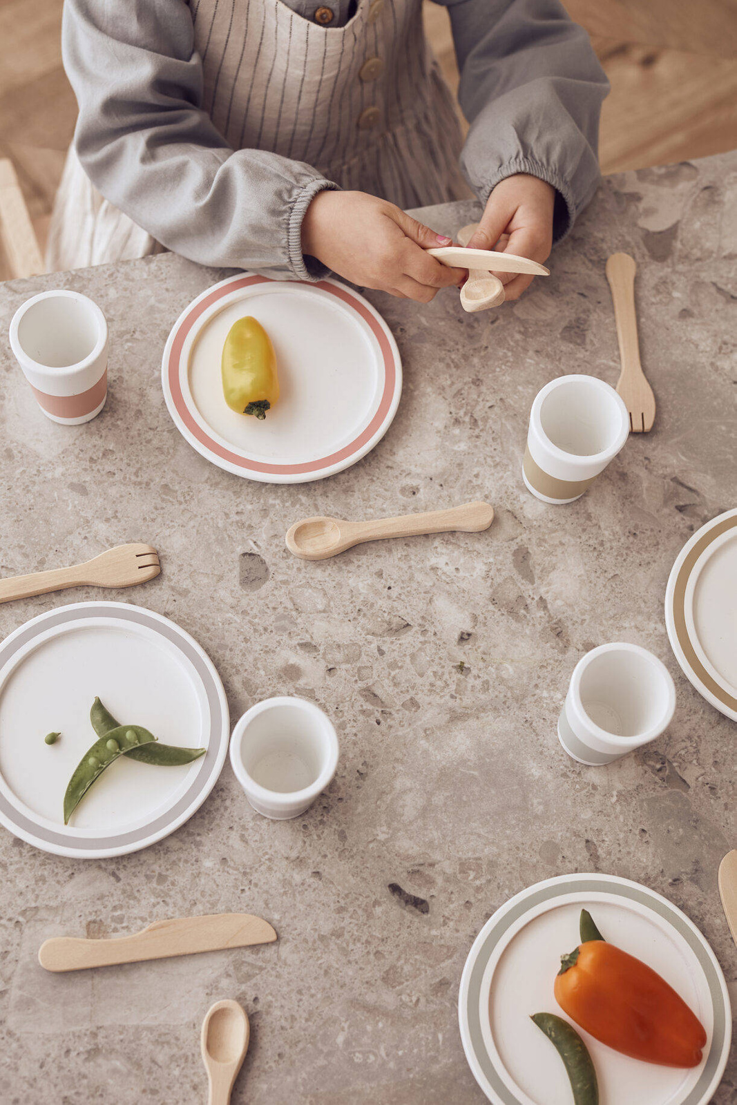 - Obiad na stole! Kompletny drewniany zestaw obiadowy dla 4 osób, składający się z 20 elementów. Zawiera 4 drewniane talerze, 4 kubki, 4 noże, widelce oraz łyżki i jest doskonałym dodatkiem do każdej drewnianej kuchni małego kucharza.