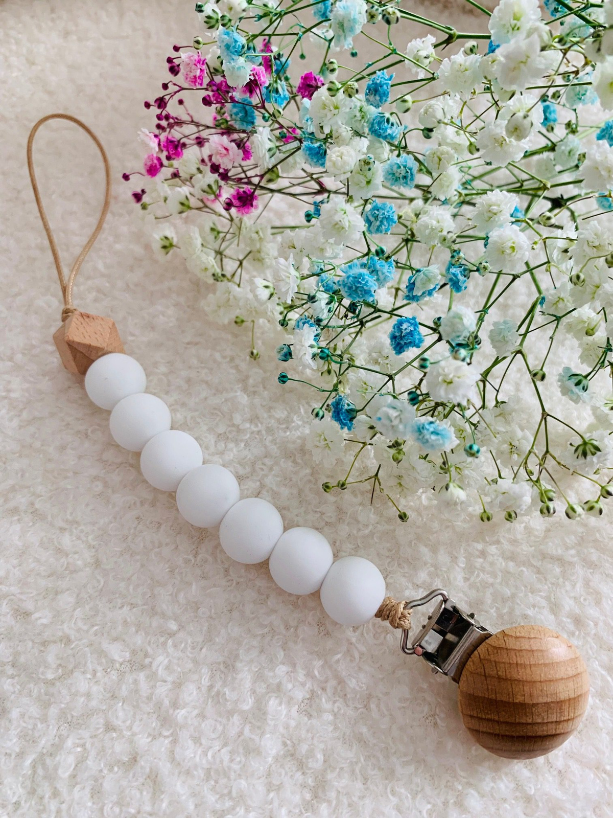 Koralikowa zawieszka do smoczka, kolor biały