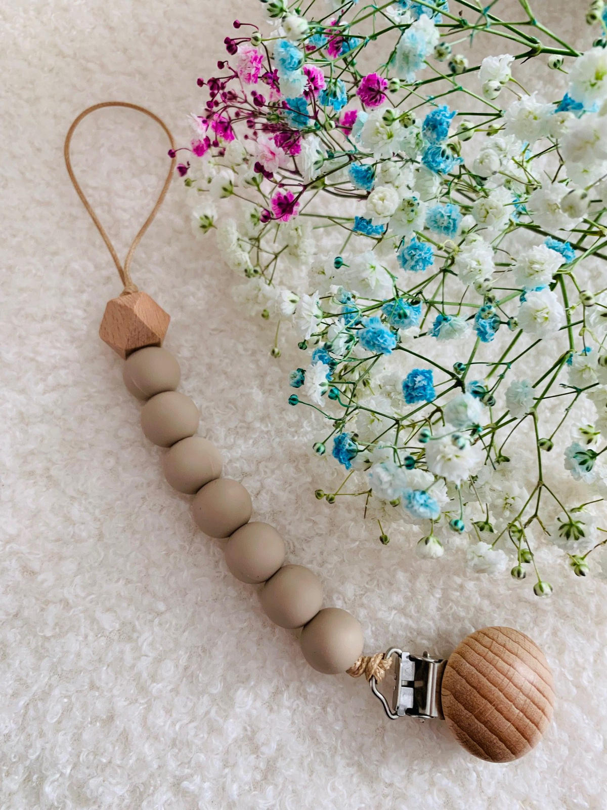Drewniany łańcuszek do smoczka z klipsem to wspaniały upominek dla malucha. Jest uniwersalny, pasuje do każdego rodzaju smoczka. Umieszczony na zawieszce smoczek będzie bezpieczny i się nie zgubi. Produkt zapakowany jest w ekologiczne pudełko prezentowe. Długość zawieszki: około 22 cm Pielęgnacja: