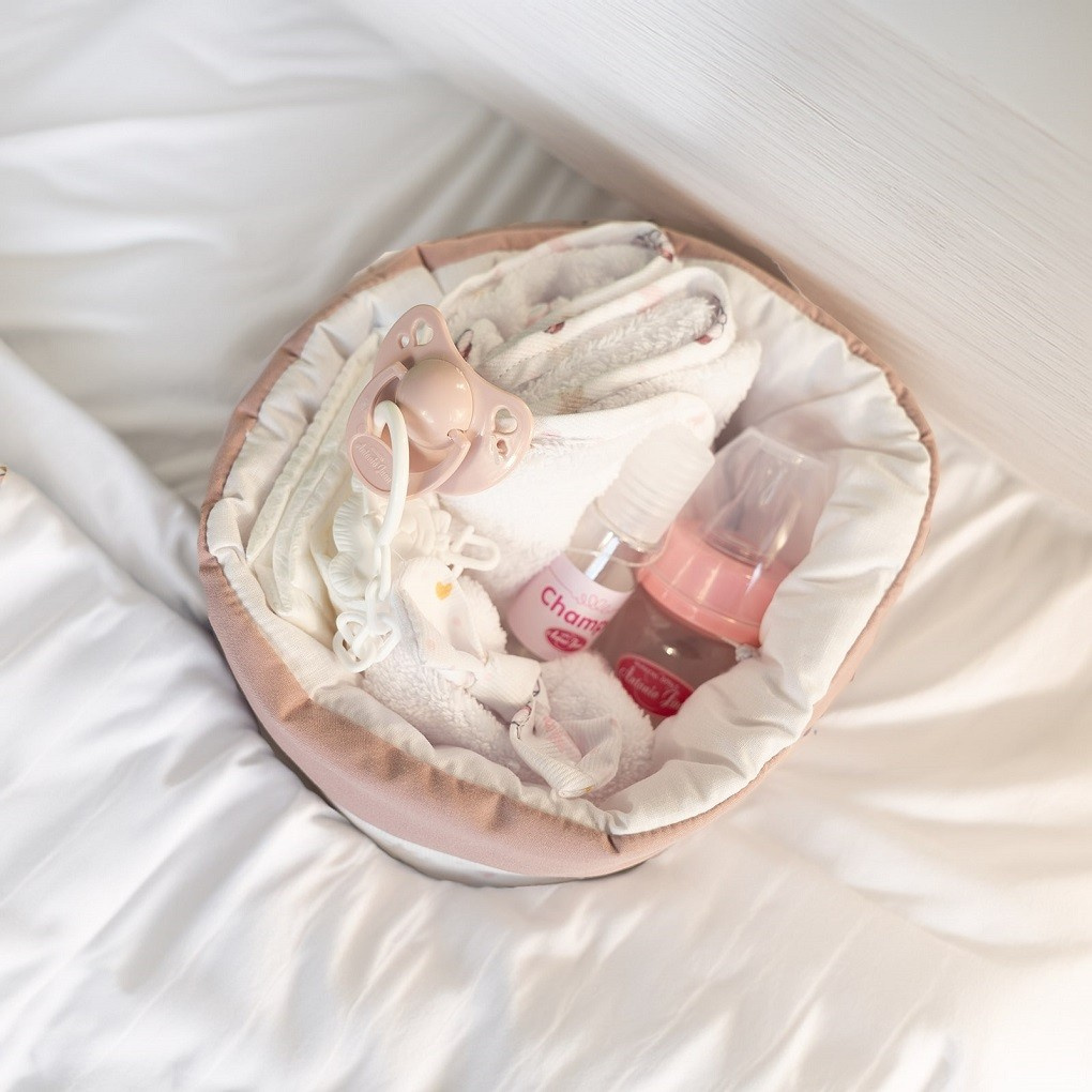 - miękki koszyk o biało-pudrowej kolorystyce, o wymiarach ok. 21cm x 16cm,