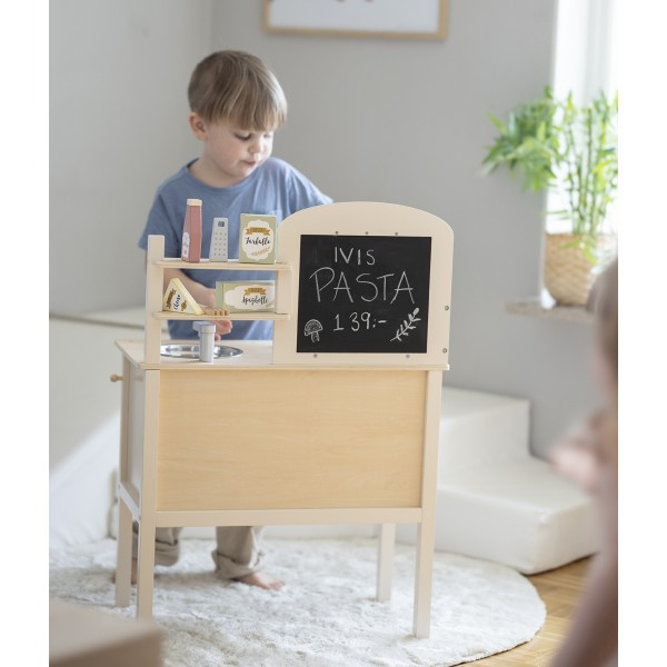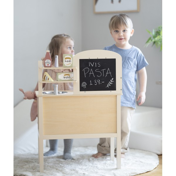 Urocza drewniana kuchnia szwedzkiej marki Jabadabado - zachwyca swoją jasną, stonowaną kolorystyką. W kuchni znajdziesz półki, szafkę oraz haki, które pomieszczą wszystkie twoje kuchenne przyrządy. Dwa palniki w kuchence regulowane są ruchomymi pokrętłami. Kuchnia posiada również piekarnik, zlew a także tablicę. Dodatkowo do zestawu dołączone są dwa garnki.