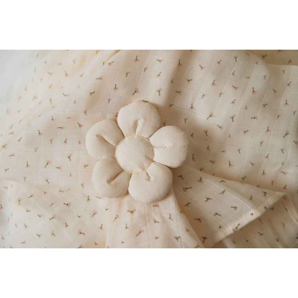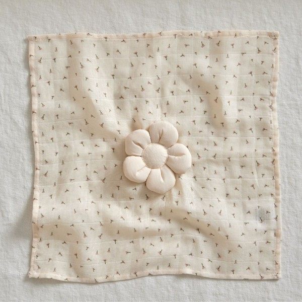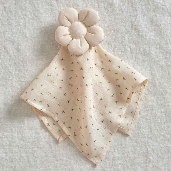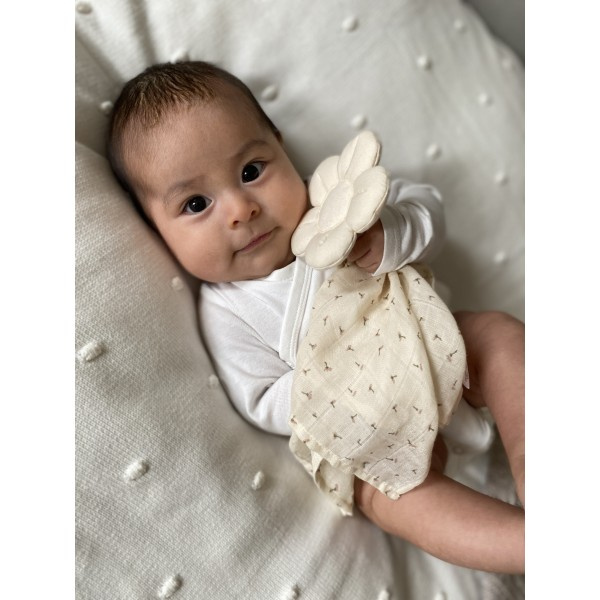 Bawełniana kremowa w drobne kwiatuszki-maki szmatka-przytulanka kwiatek to must have, każdej wyprawki dla malucha, towarzyszy dzieciom już od pierwszych dni, otulając ciepłym miłym dotykiem.