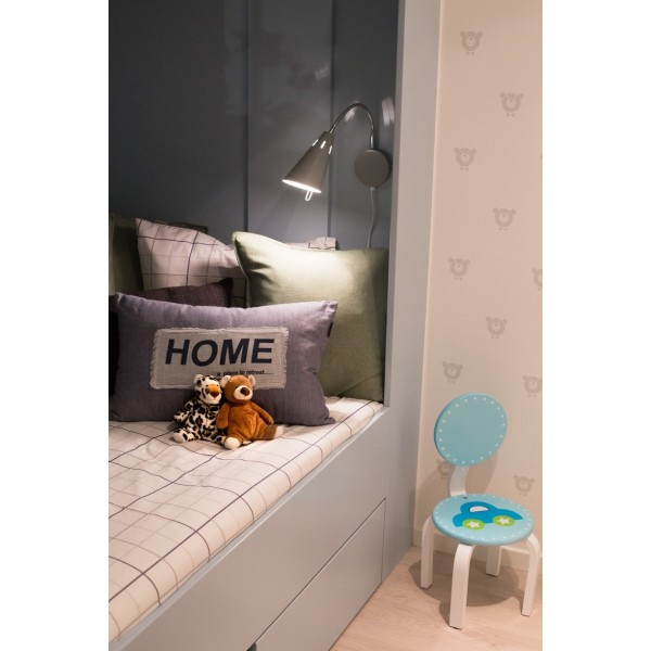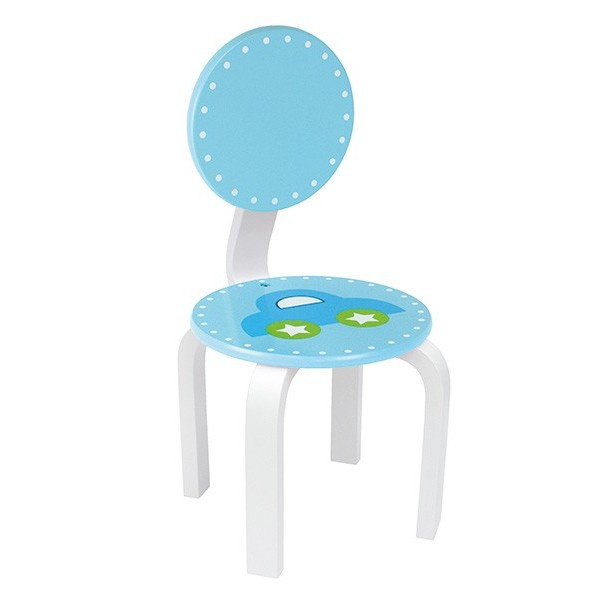 Śliczne niebieskie, drewniane krzesełko z oparciem i wizerunkiem niebieskiego auta szwedzkiej marki Jabadabado. Idealnie wkomponuje się w wystrój pokoju małego fana motoryzacji, pasuje do pozostałych dodatków do aranżacji dziecięcych wnętrz.
