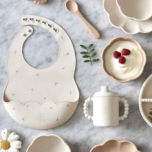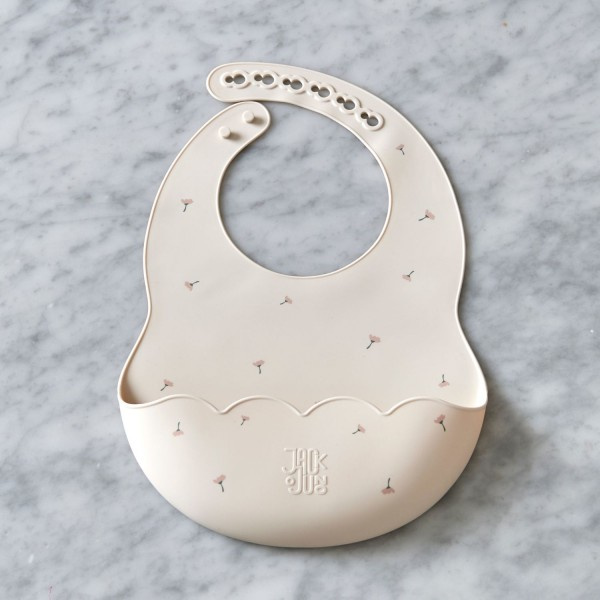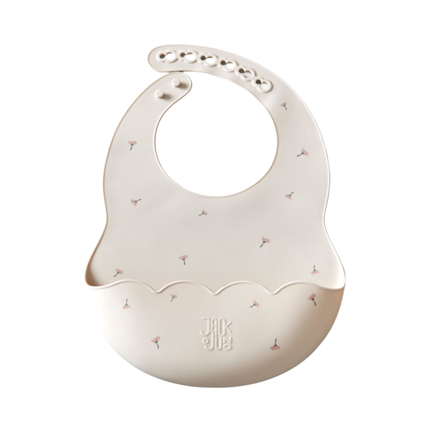 Kremowy  silikonowy  śliniak inspirowany kwiatami : posiada uroczą kieszonkę do przechwytywania upuszczonych resztek pokarmu, niezwykle pomocną w utrzymaniu czystości i regulowany rozmiar szyi. Śliniak można czyścić w zmywarce, lub wystarczy przetrzeć ciepłą wodą - wygląda bardzo elegancko świetnie sprawdzi się na prezent, jest miękki i lekki.  Ten cudny śliniak wykonany jest z silikonu platynowego, dzięki czemu jest on trwalszy i odporniejszy, na wysokie temperatury - zestaw nadaje się do piekarnika, mikrofalówki oraz  zmywarki, posiada lepsze właściwości mechaniczne -  odporność na rozciągnie i rozrywanie, nie posiada zapachu i smaku. Platynowy silikon nie jest utwardzany nadtlenkiem tylko platyną, dzięki temu jest znacznie bezpieczniejszy dla maluchów niż silikon spożywczy.  Zestaw nie zawiera: BPA, ftalanów, PVC, ołowiu, kadmu i innych szkodliwych substancji chemicznych, testowany przez LFGB. Właściwości silikonowych produktów marki JackOJuno - są w pełni bezpieczne dla dzieci, jak i środowiska 100% biokompatybilne.  Wymiary: 32 x 22 cm Użytkowanie: można myć w zmywarce - zazwyczaj wystarczy przetrzeć mokrą ściereczką nie należy pozostawiać rzeczy mocno kwaśnych na bardzo długą, np. całą noc - aby nie doszło do odbarwień Ten śliniak przeznaczony jest dla najmłodszych już od 6 msc życia, w pełni bezpieczny i przystosowany - idealny do nauki samodzielnego jedzenia.  Szwedzka marka JackOJuno prosto ze Sztokholmu, to idea dwóch mam, które w poszukiwaniu ekologicznych produktów premium, dla swoich maluchów z potrzeby serca, tworzą markę akcesoriów dziecięcych z najwyższej półki. Magiczny, stonowany, skandynawski design, delikatna kolorystyka, ozdobne opakowania, tylko ekologiczne materiały z troską o środowisko - to wyróżnia produkty marki JackOJuno.