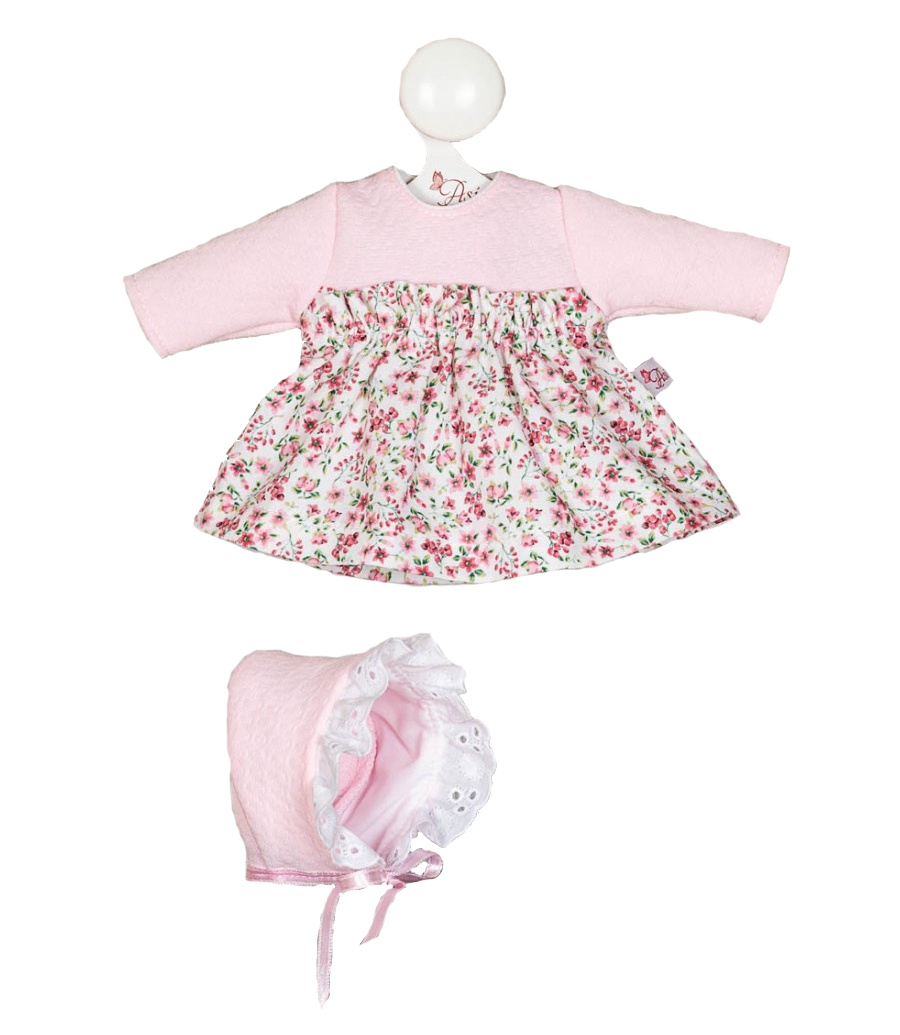 W szafie lalki marki Asi na pewno znajdzie się miejsce na strój przeznaczony dla dziewczynki o wysokości 30 cm. Strój będzie świetnie leżał na lali o imieniu Oli. Komplet składa się z sukienki zapinanej na rzepę oraz zawiązywanej czapki. Góra sukienki jest wykonana z różowej tkaniny, natomiast dół ubranka jest rozkloszowany i ozdobiony kwiecistym wzorem. Okrycie głowy zostało wykończone białą ażurową wstawką i jest wiązane przy pomocy różowych wstążeczek. Strój urzeka, mięciutkim i przyjemnym w dotyku materiałem. Komplet wykorzystasz na wiele okazji.