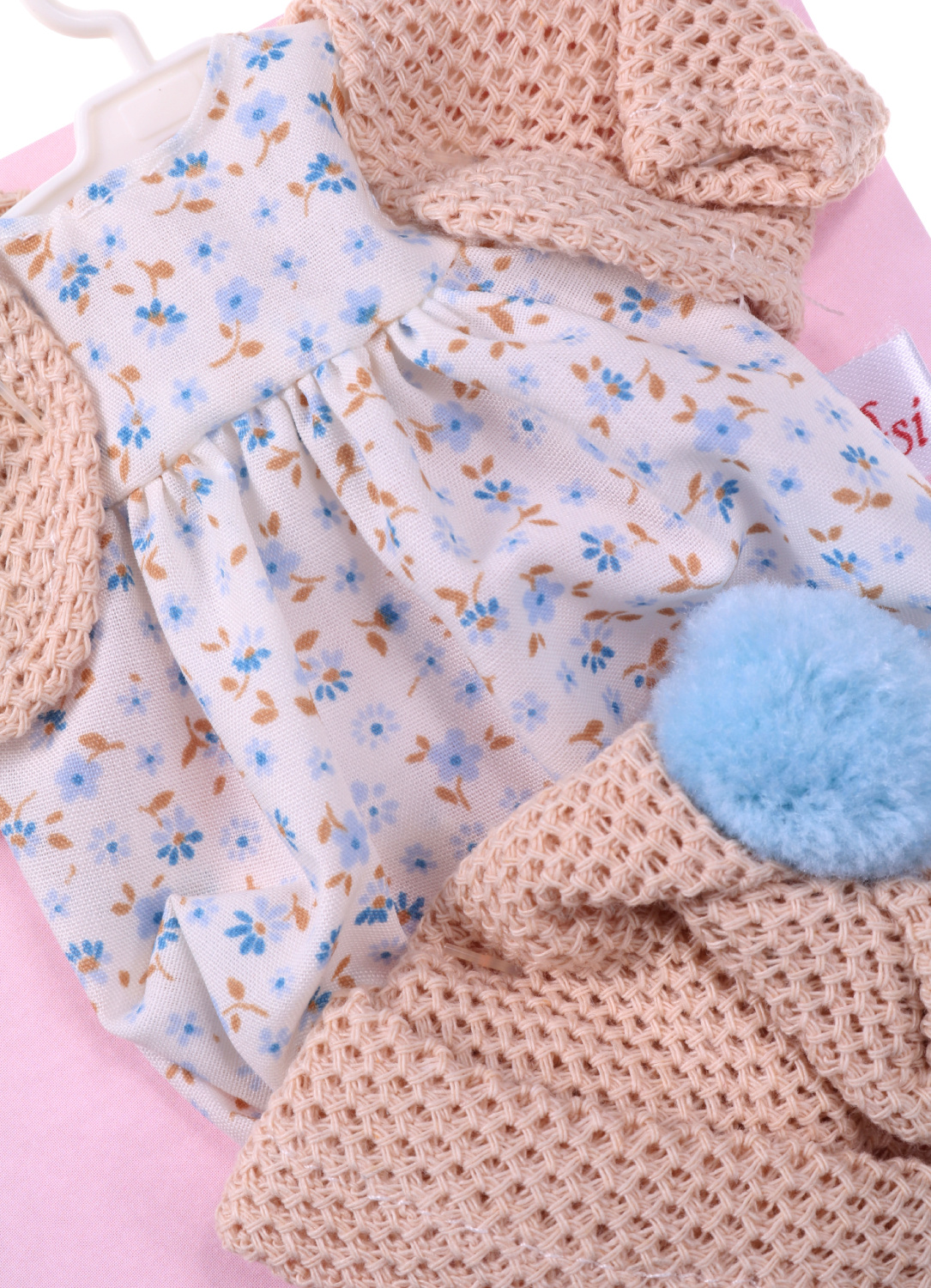 Spodenki ze sweterkiem są przeznaczone dla lalki o wysokości 20 cm. Komplet uzupełnia kolekcję ubranek hiszpańskiej marki ASI. Body z zestawu wykonane w beżowym kolorze zdobi wzór w drobne kwiatuszki. Strój uzupełnia beżowy sweterek z dzianiny oraz wsuwana czapka z pomponem. Dodatki przydadzą się do otulenia lali szczególnie w chłodniejsze dni.