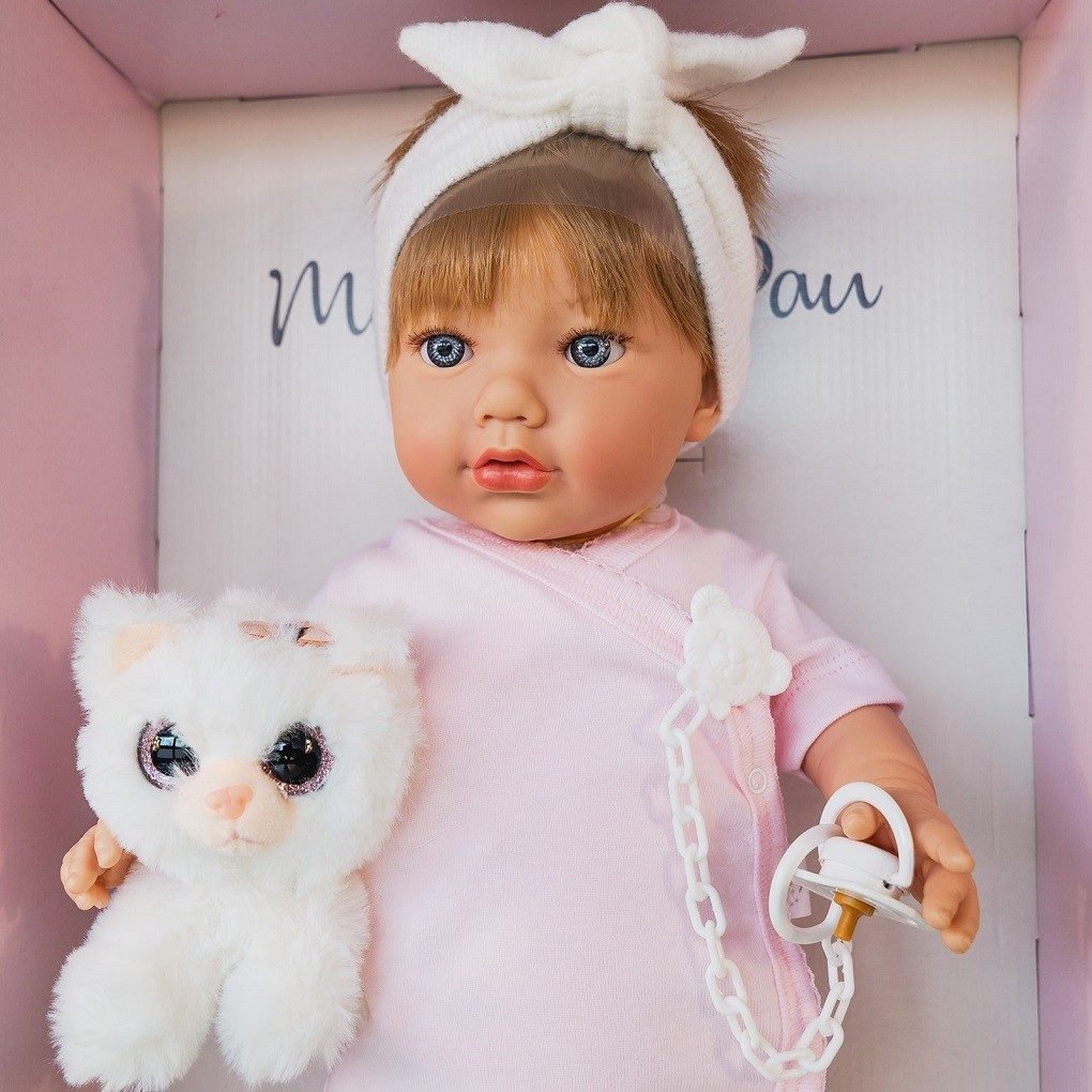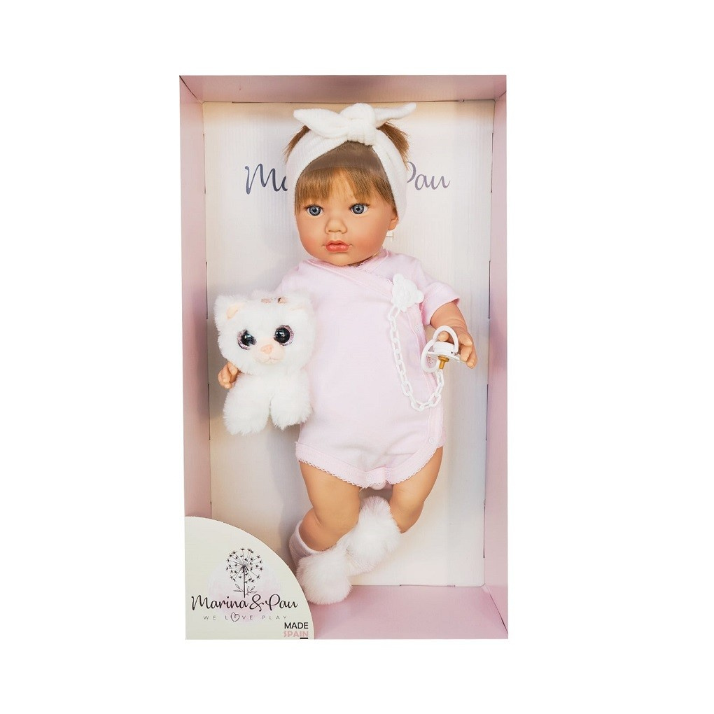 Słodko prezentująca się lalka hiszpańska MP1159 doskonale wpisuje się w asortyment cenionej marki Marina & Pau, znanej z łączenia pasji, tradycji i innowacyjności. 45-centymetrowa Alina wygląda jak prawdziwa dziewczynka z krótkimi, blond włosami. W komplecie znajduje się pluszowa maskotka – kotek oraz przypinany smoczek na łańcuszku. Dzięki zastosowaniu miękkiego, materiałowego brzuszka lalka jest świetna także jako przytulanka. Z kolei głowę i kończyny wykonano z  wysokiej jakości gładkiego, przyjemnego w dotyku jasnego winylu.