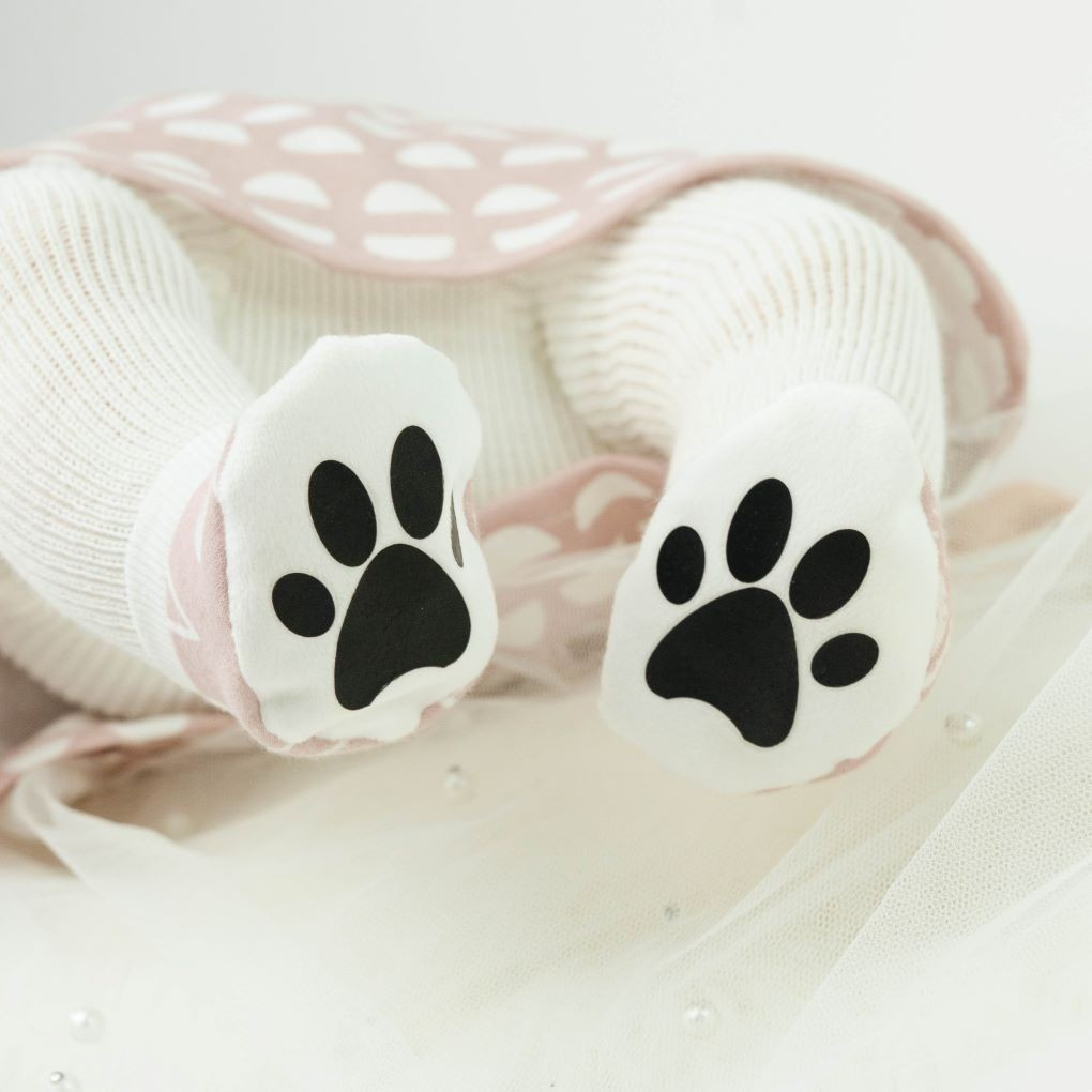 Alina ma na sobie uroczy liliowy komplet. Strój składa się z sukienki na krótki rękaw ozdobionej białym, drobnym wzorem. Dopełnienie zestawu stanowi bluza z kapturem z grafiką misia, białe rajstopki i materiałowe buciki. W zestawie nie mogło również zabraknąć smoczka z zawieszką misia, który jeszcze bardziej urozmaici dziecięcą zabawę.