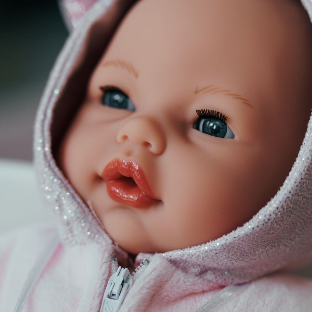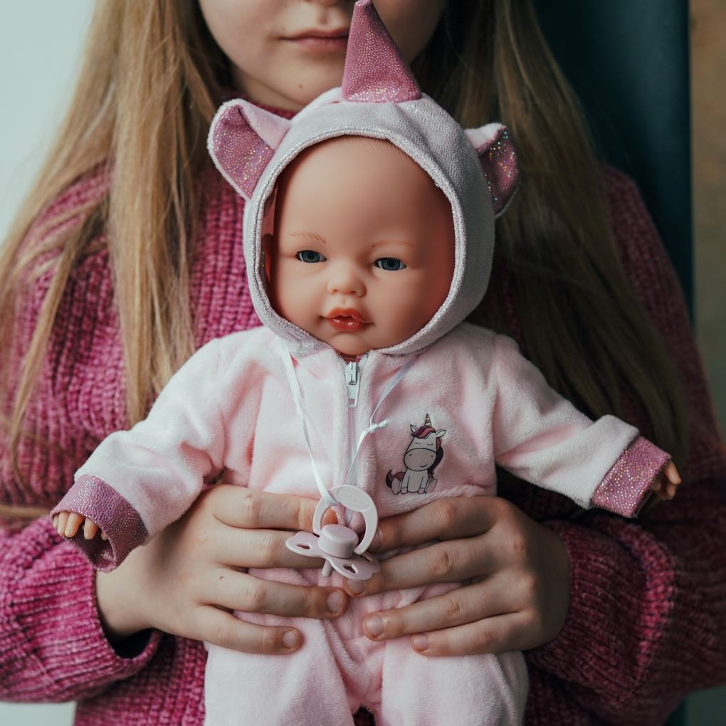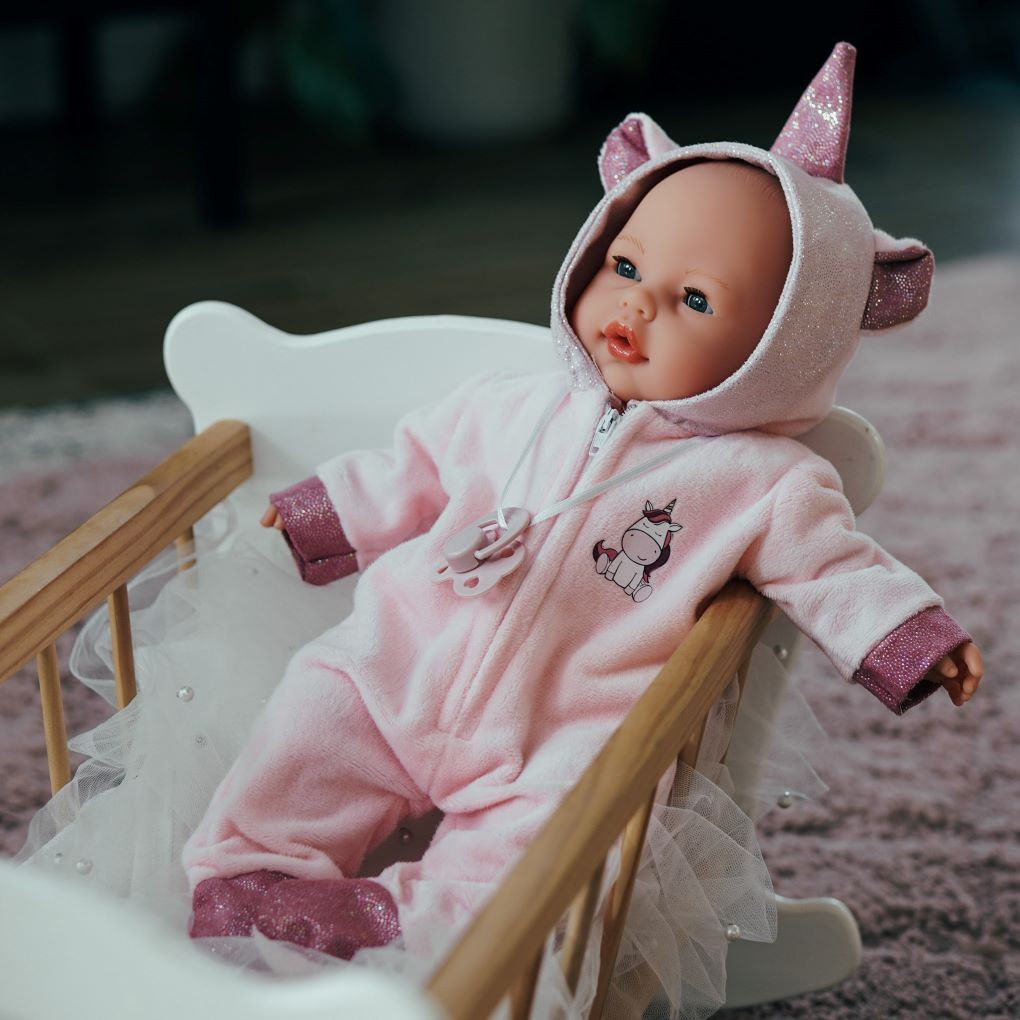 Realistycznie wyglądający, winylowy bobas z miękkim brzuszkiem posiada wyrzeźbione włoski oraz delikatnie malowane brwi, usta, paznokcie i fałdki. Bimba 14362 od marki Antonio Juan ubrana jest w miękką piżamkę z kapturem. Przyciąga wzrok aplikacja jednorożca oraz różowe, brokatowe wykończenia. Dzięki zastosowaniu zamka ubranko z łatwością można założyć i zdjąć. W komplecie znajduje się także smoczek na tasiemce.