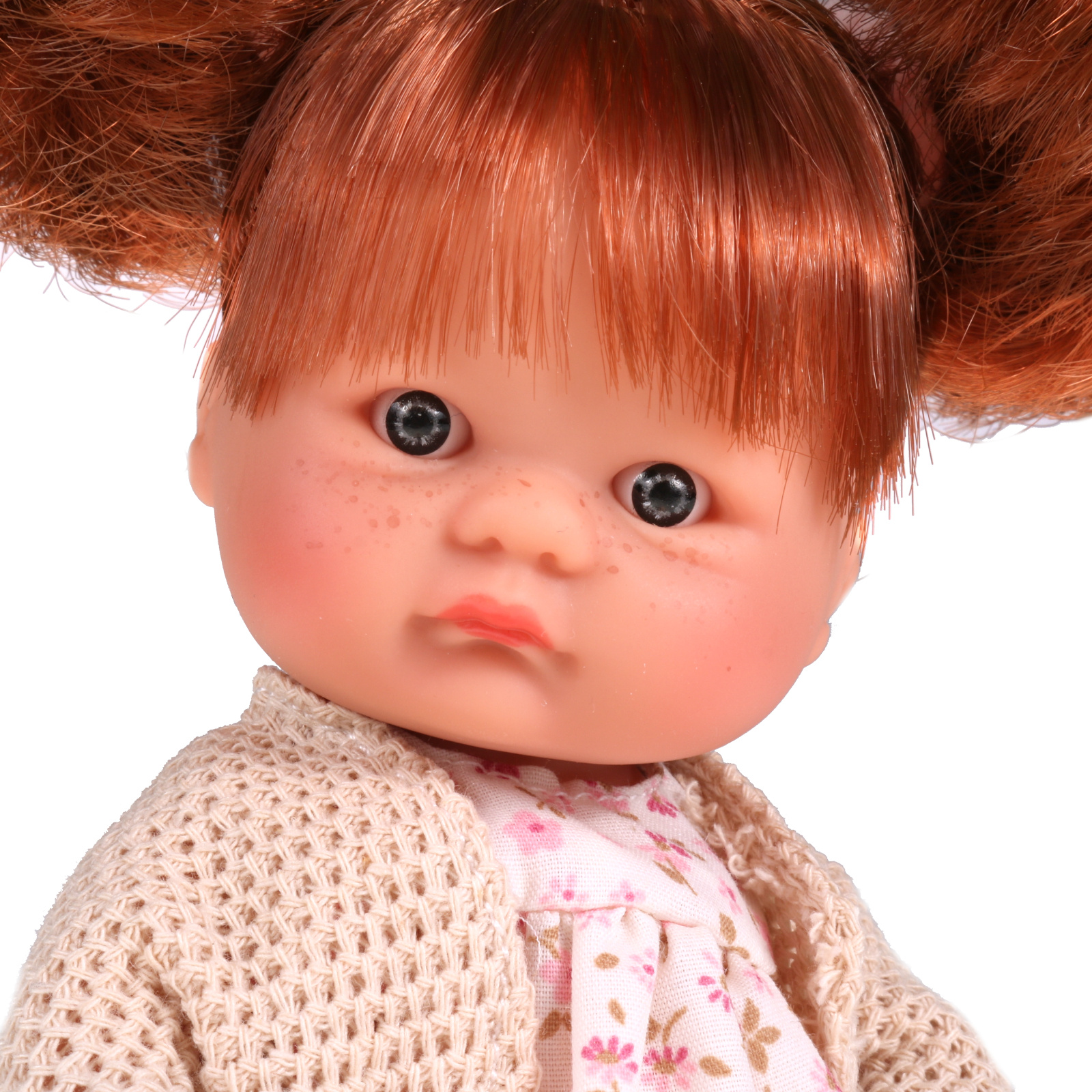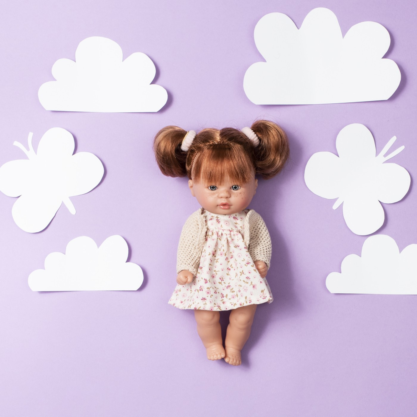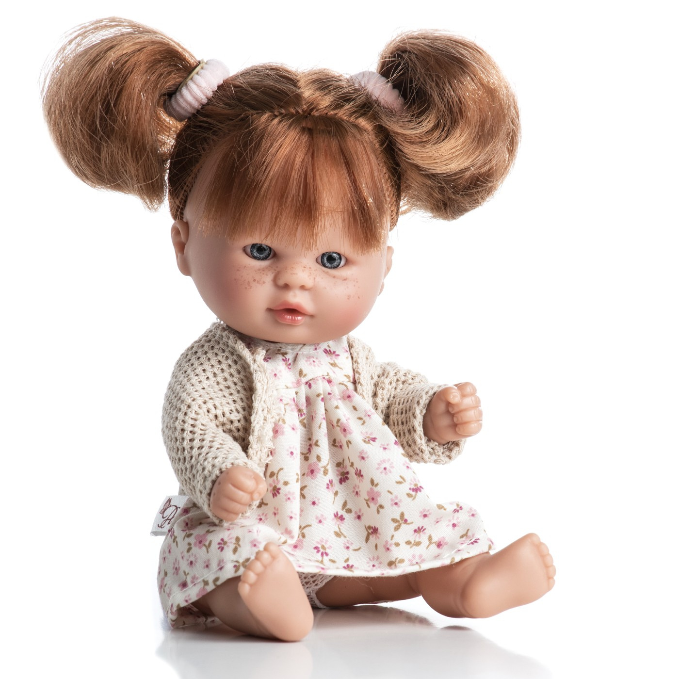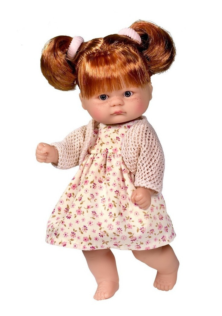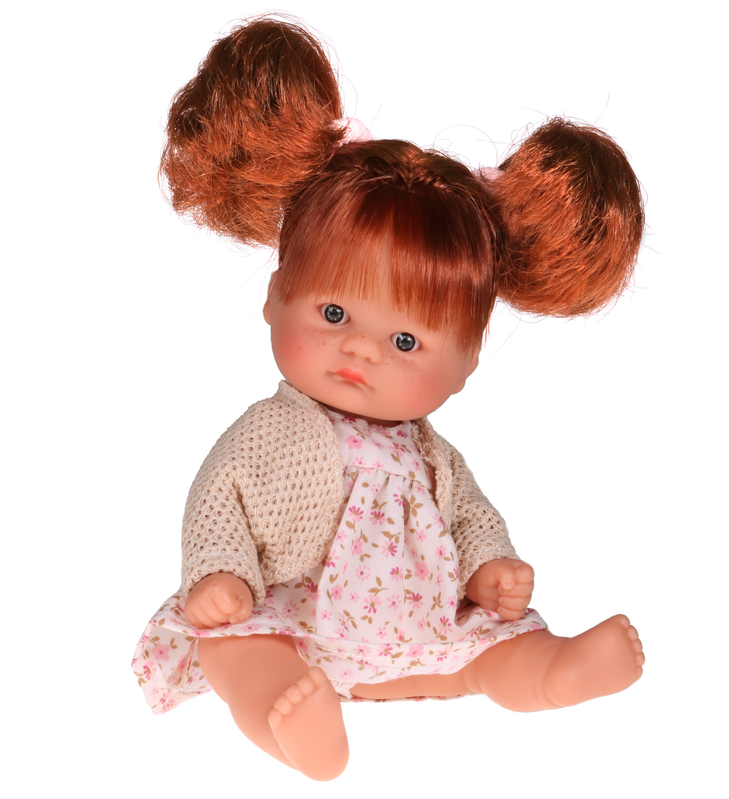 Bomboncin ubrana jest w białą sukienkę na krótki rękaw ozdobioną różowymi kwiatuszkami. Ubranko jest zapinane na rzepy, aby można było je łatwo zdjąć, a zabawa naszego urwisa w przebieranie niemowlaka stała się jeszcze ciekawsza. Pod ubrankiem znajdują się białe, siateczkowe majteczki, które również można zdjąć. Wygląd lalki uzupełnia beżowy sweterek z dzianiny. Bolerko przyda się do otulenia lali szczególnie w chłodniejsze dni. Dziecko może troszczyć się o swoje maleństwo, przebierać je i zabrać wszędzie, by poczuć się jak prawdziwa mama.