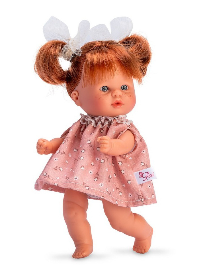 Rudowłosa hiszpańska lala z serii Asi Bomboncin 0117400 z pewnością urzeknie każdą dziewczynkę, która uwielbia wcielać się w rolę małej opiekunki. Ręcznie szyta, rozszerzana ku dołowi, bawełniana sukieneczka w kolorze pudrowego różu ma nadrukowane śliczne kwiatuszki. Zdejmowana przez szyję kreacja na gumeczce została wykończona misterną koronką, która dodaje całości szyku. Stylowy outfit uzupełniają miękkie, białe, elastyczne majteczki na gumeczce.