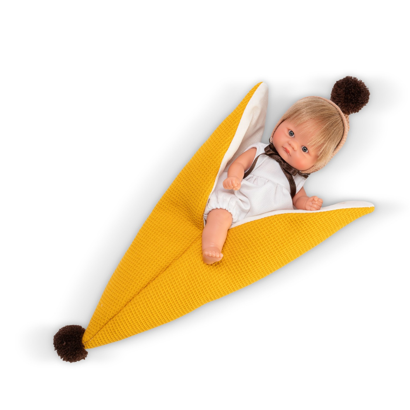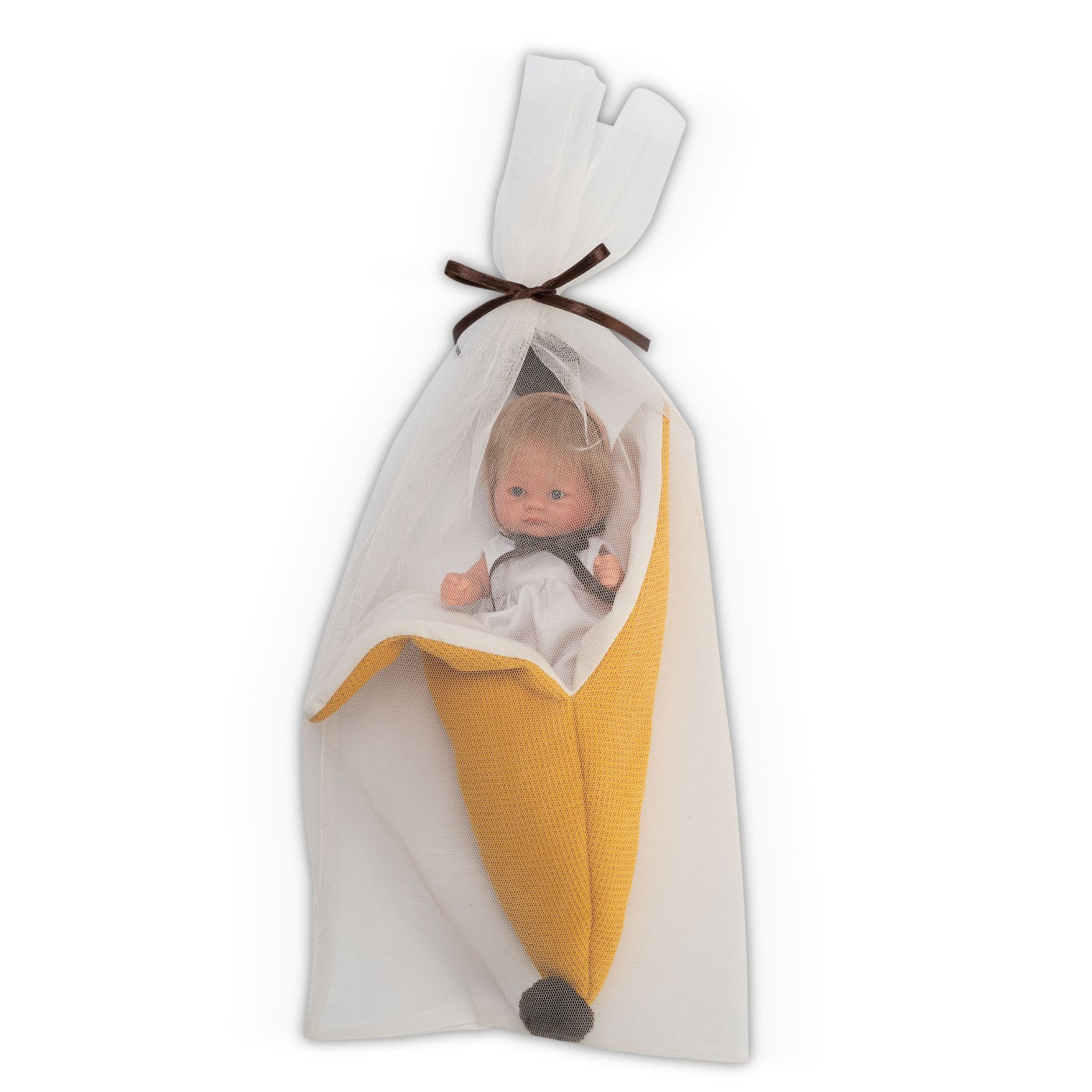 Hiszpańskie lalki winylowe z serii Bomboncin są idealne do przebierania, kąpania oraz zabaw w troskliwą mamusię. Model Asi 0117900 to słodka i śliczna dziewczynka z krótkimi blond włosami, dostępna w komplecie z miękkim łóżeczkiem w kształcie banana. Zaprojektowana dla dzieci w wieku od 3 lat. Zachwyca dopracowanym wyglądem i klasycznym, szytym ręcznie strojem. Wysokiej jakości winyl przypomina w dotyku delikatną skórę bobasa. Naturalny, grymaśny wyraz twarzy, zaciśnięte piąstki, zaznaczone linie papilarne oraz malutkie paznokcie sprawiają, że lalka wygląda jak prawdziwe dziecko.
