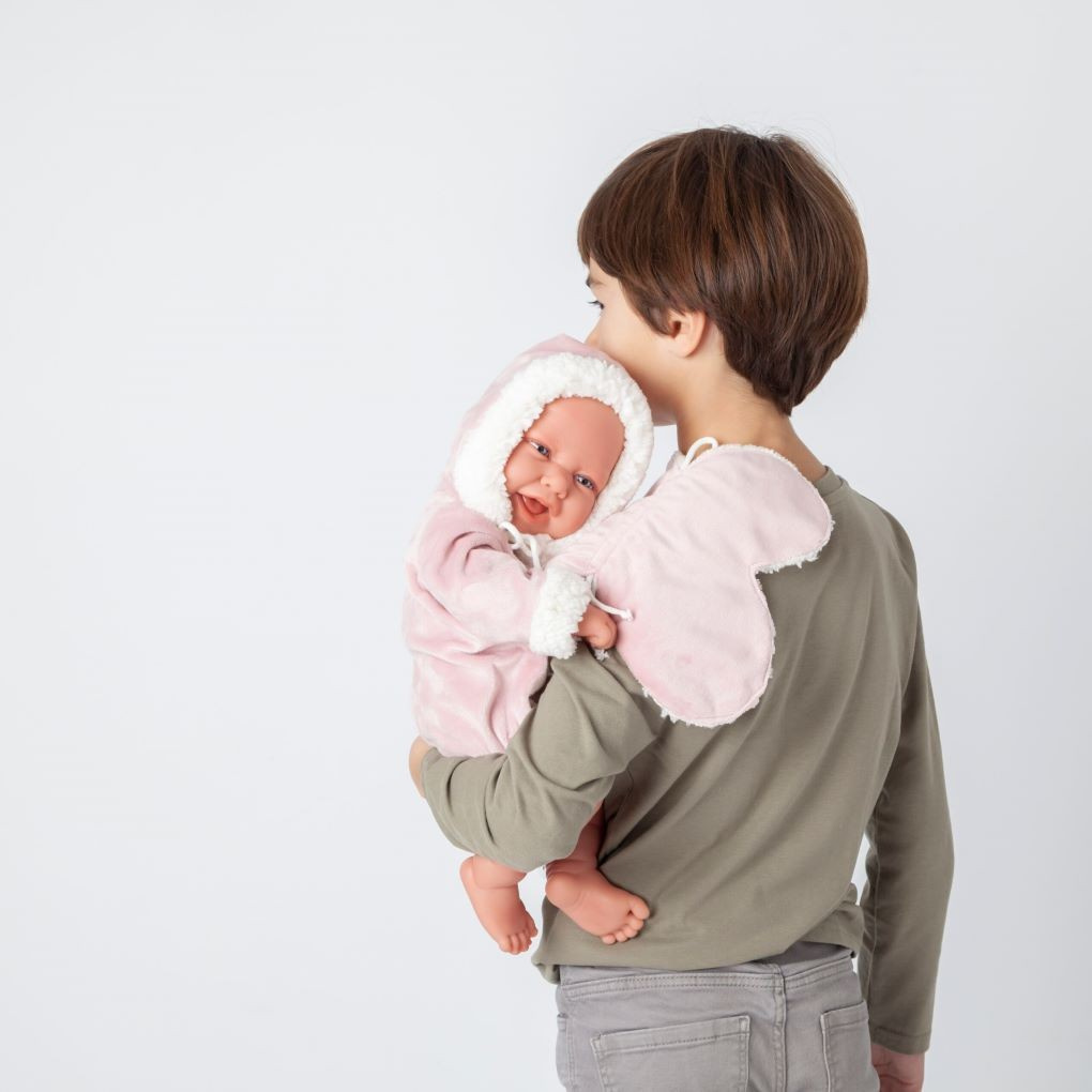 Lalka hiszpańska 50395 marki Antonio Juan to marzenie każdego dziecka, uwielbiającego zabawę w odgrywanie ról. Autentyczny wygląd pozwala z łatwością wcielić się w rolę troskliwego rodzica. Carla ubrana jest w oryginalnie zaprojektowany, ciepły jasnoróżowy rampers z wiązanym pod szyją kapturem. Zwracają uwagę wykończenia z owczej skóry. Strój z łatwością można zdjąć, a bobasa przebrać lub wykąpać.