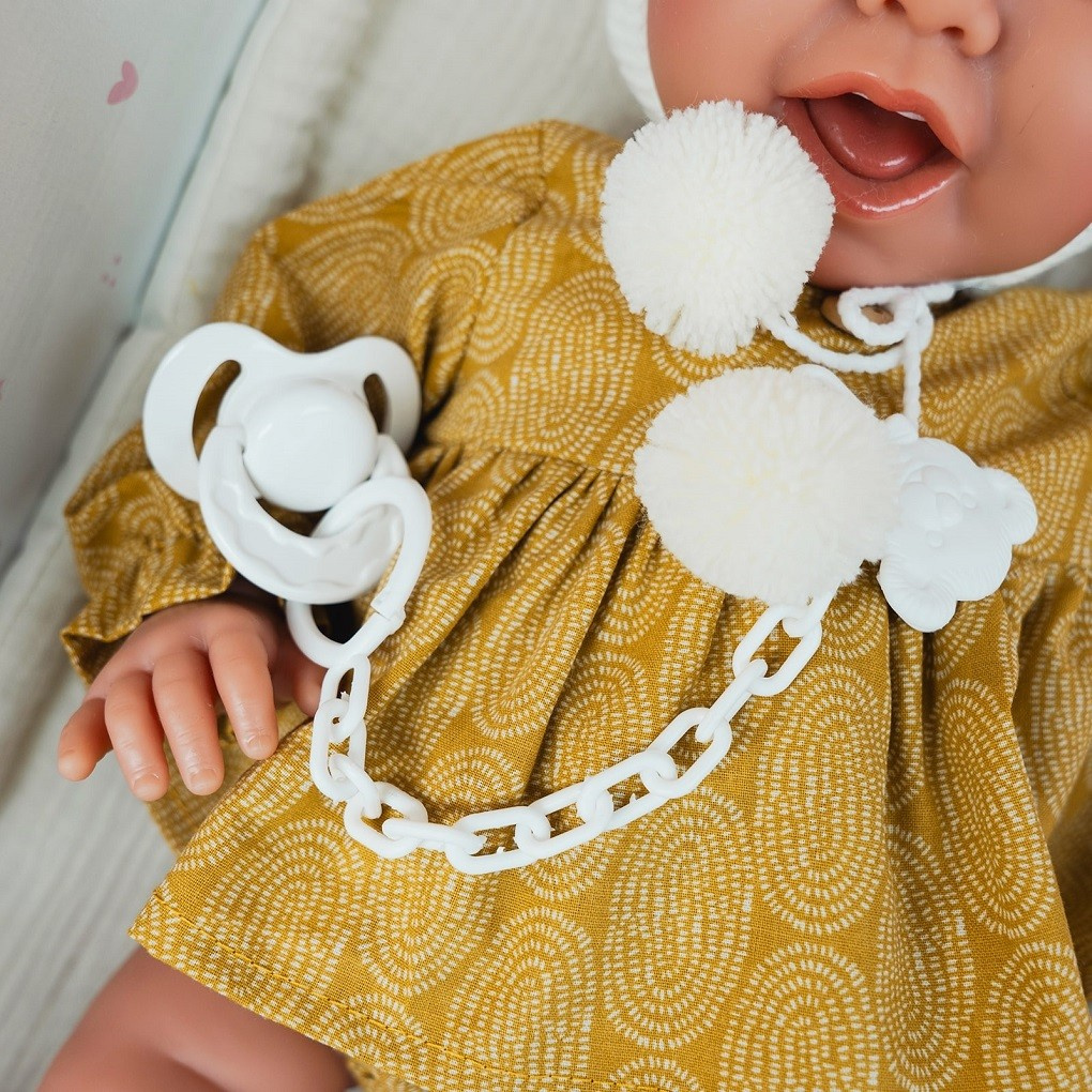 Maleństwo ma na sobie musztardową sukienkę na długi rękaw. Do kreacji odciętej w talii przyszyto guziczek. Dodatkowej elegancji doda zakończenie rękawków. Dziewczynkę wyposażono również w bufiaste majteczki o identycznym wzorze co sukienka. Dziecięcą zabawę urozmaici dołączony do lali smoczek na łańcuszku i beżowy kocyk wyglądający niczym materac. Dodatki przydadzą się podczas układania bobasa do snu.
