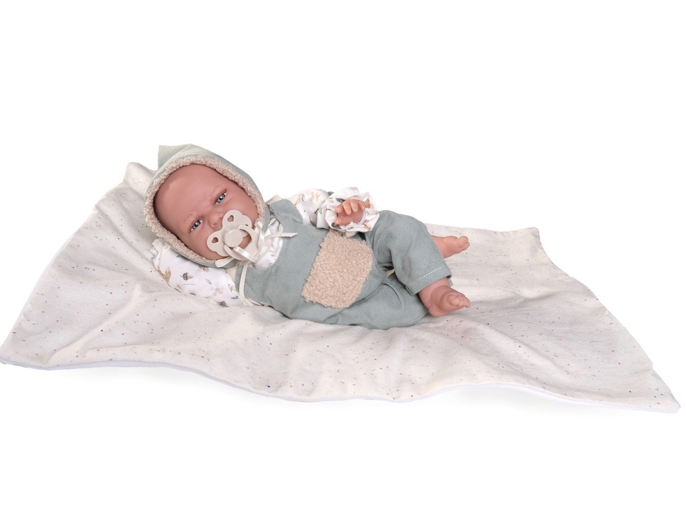 Realistycznie wyglądający bobas posiada wyrzeźbione włoski oraz delikatnie malowane brwi, paznokcie i fałdki. Baby Clara od marki Antonio Juan ubrana jest w mięciutką bawełnianą bluzeczkę w subtelny wzór, sztruksowe ogrodniczki z futrzaną kieszonką oraz ciepłą wiązaną czapeczkę. Wszystkie elementy garderoby można łatwo zdjąć, a maleństwo przebrać w inny zestaw ubranek. W komplecie z bobasem znajduje się także smoczek na tasiemce oraz miękki kocyk.