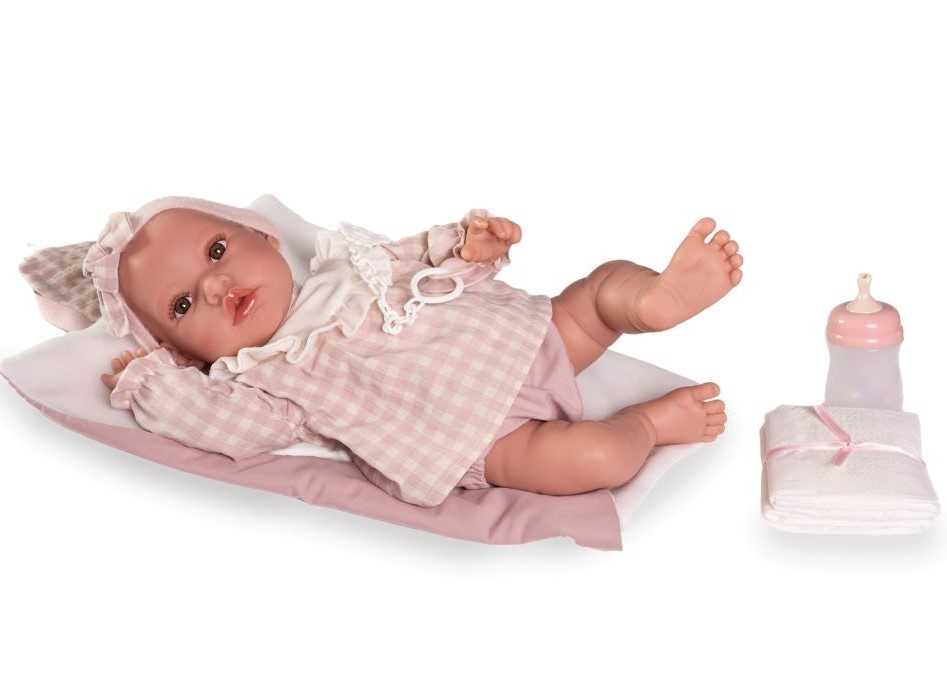 Lalka hiszpańska 33002 marki Antonio Juan to marzenie każdego dziecka, uwielbiającego zabawę w odgrywanie ról. Autentyczny wygląd i waga bobasa pozwalają z łatwością wcielić się w rolę troskliwego rodzica. Erika ubrana jest w oryginalnie zaprojektowaną, biało-różową bluzeczkę w modną kratkę. Elegancji dodaje biała wstawka z falbanką tuż przy dekolcie. Outfit dopełniają krótkie pudrowe spodenki oraz opaska na głowę. Strój z łatwością można zdjąć, ponieważ posiada on z tyłu wygodne zapięcie na rzep. W zestawie znajduje się także plastikowa butelka oraz przypinany smoczek na łańcuszku a także kocyk do przewijania.