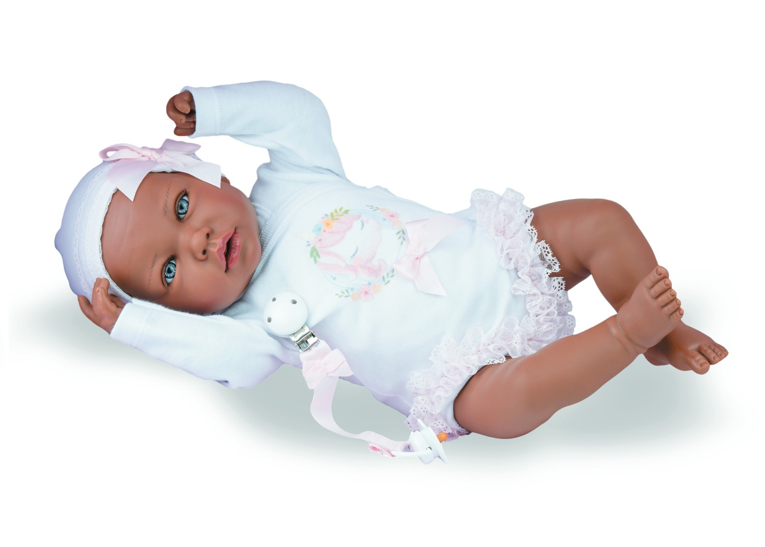 Przepiękna, czarnoskóra dziewczynka o imieniu Gala to wyjątkowy, 45-cm. bobas z kolekcji ekskluzywnych lalek hiszpańskich cenionej marki Marina & Pau. Posiada duże, niebieskie oczy wyglądające jak prawdziwe, a ich oprawa została podkreślona gęstym wianuszkiem rzęs oraz delikatnym zarysem ręcznie malowanych brwi. Model 1232 ma skrupulatnie wyrzeźbione włoski na przyciemnionej główce. Miękki brzuszek w kolorze skóry sprawia, że lalka świetnie nadaje się do przytulania. Niewątpliwym atutem jest też wysokiej jakości, ręcznie szyty strój w typowo dziewczęcej wersji. Zabawkę proponujemy dzieciom w wieku od 3 lat.