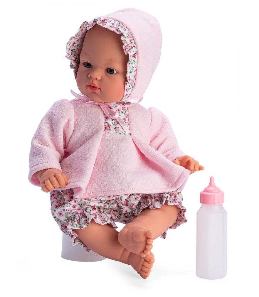 Koke ubrana jest w różową bluzkę na długi rękaw. Na środku ubranka wszyto kwiecistą wstawkę. Ubranko jest zapinane na rzepę co ułatwi dziecku zdejmowanie stroju, a zabawa w przebieranie stanie się jeszcze ciekawsza. Zestaw lalki uzupełnia różowa czapka wiązana pod brodą na kokardkę, a ponadto udekorowana falbanką w kwiaty. Dodatkowo stylizację dopełnią eleganckie bufiaste spodenki na gumce. Koke można przebierać bez końca, przytulać oraz zabierać ze sobą na drzemkę. Zabawie więcej możliwości doda dołączona do zestawu butelka. Pojemnik odkręca się i można napełnić go wodą.