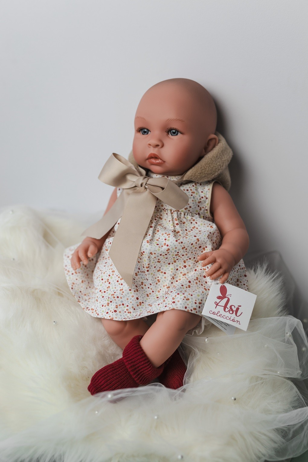Lalka hiszpańska marki ASI ubrana jest w klasyczną sukienkę w kolorowe kropeczki, wiązaną ciepła czapeczkę, elegancki płaszczyk z kołnierzykiem i mankietami, czerwone skarpetki oraz białe majteczki.