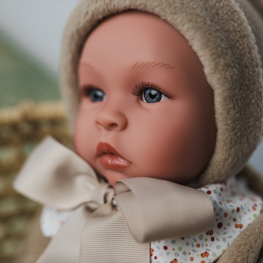 Lalka hiszpańska ASI 0187700 została wykonana z wysokiej jakości gładkiego, miękkiego w dotyku winylu, przypominającego w dotyku skórę niemowlaka. Z kolei brzuszek bobasa jest uszyty z tkaniny i wypełniony miękką wyściółką z włókien kapokowych. Naturalny materiał jest bardzo lekki i sprężysty, długo zachowuje swoje pierwotne właściwości.