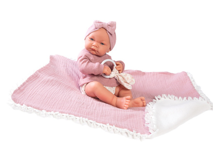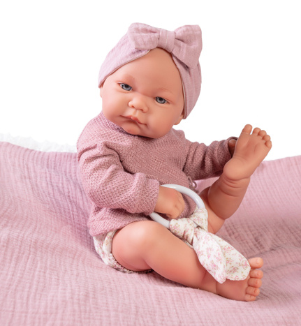 Nica 50278 w ślicznej różowej stylizacji uwielbia bawić się gryzakiem z uszkami. Ten noworodek to kolejny model uzupełniający kolekcję winylowych lalek do kąpieli. Proponowany model poszerzy bogaty asortyment serii Recien Nacida Antonio Juan. Bobas nie posiada włosów, a na jego główce można dostrzec rzeźbienia. Dodatkowo powierzchnię główki przyciemniono, aby wyglądała jak u noworodka. Laleczka ma 42 cm wysokości i waży około jednego kilograma i bardzo chętnie z każdym się pobawi. Ma ręcznie malowane niebieskie oczka wyglądające niczym jak u dziecka. Oczka dziewczynki są stale otwarte. Oprawę jej oczu podkreślą długie rzęsy oraz delikatnie narysowane włoski tworzące łuk brwiowy. Tak odwzorowana laleczka stanie się najlepszą przyjaciółką niejednego maluszka uwielbiającego zabawę w dom. Dodatkowo twarz bobasa podkreśla założona na główce opaska z kokardą doskonale pasująca do kocyka.