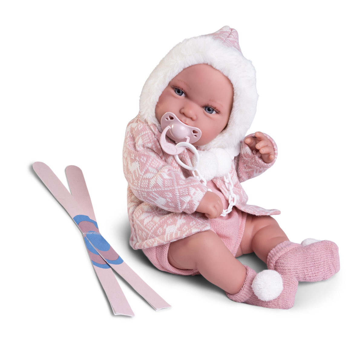 Lalka hiszpańska Recien Nacida 50406 w wersji zimowej ma ruchome rączki, nóżki i głowę, dzięki czemu można ułożyć ją w różnych pozycjach. Atrakcyjności zabawie dodaje ciepły, wysokiej jakości, ręcznie szyty outfit w kolorze pudrowego różu oraz starannie dopasowane akcesoria: