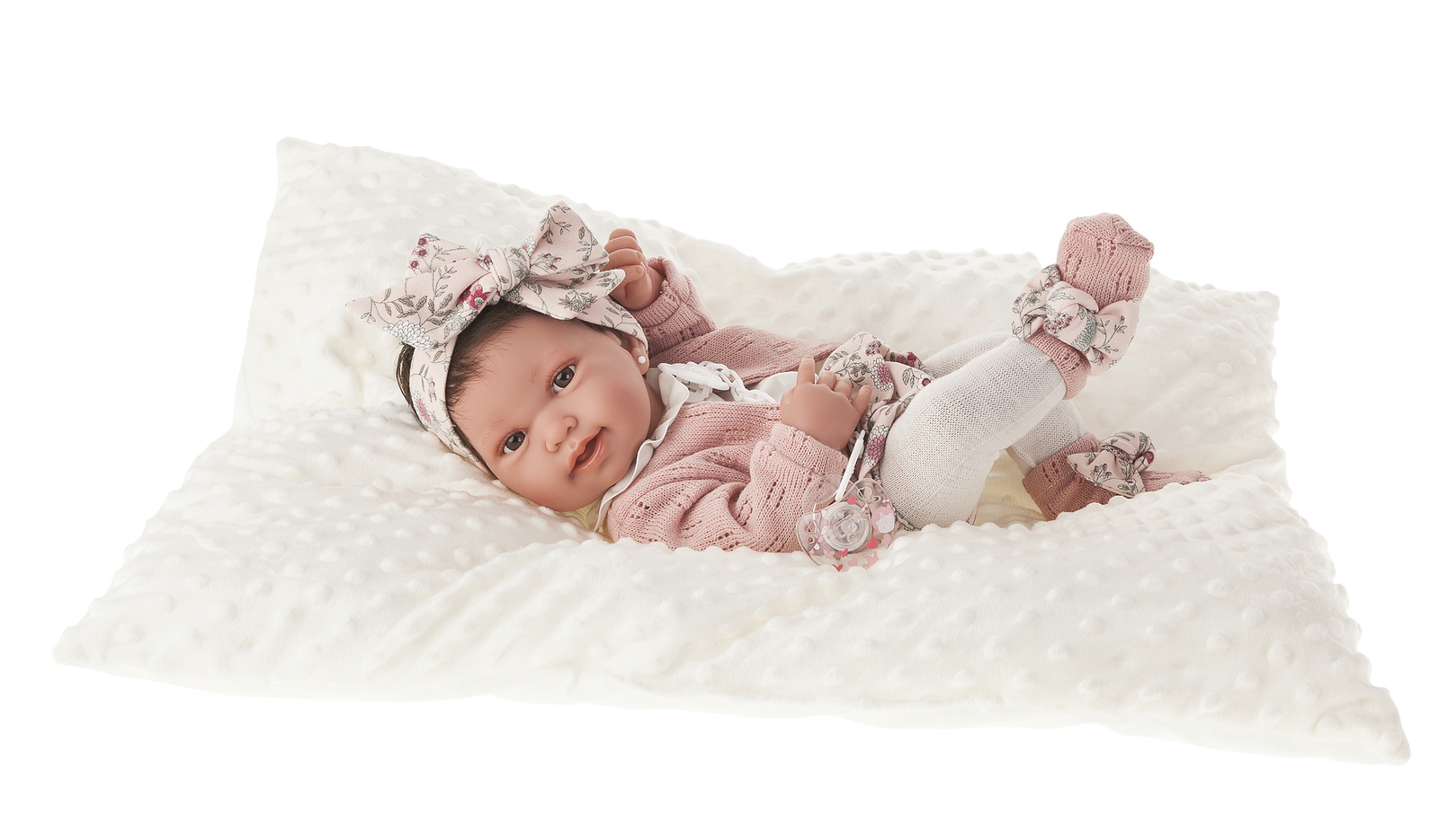 Jeszcze więcej frajdy z zabawy zapewni dołączony smoczek na łańcuszku z zawieszką, który można przypiąć do ubranka, by lala miała go zawsze przy sobie. W opakowaniu znajdziesz także mięciutką poduszkę, którą można otulić ją do snu. Podusia sprawdzi się także wyśmienicie jako wypełnienie wózka czy kołyski. Odcień oraz faktura poduszki może różnić się od tej przedstawionej na zdjęciu: biała lub ecru pikowana lub gładka. Kartonik, w którym zapakowana jest lala, może pełnić rolę łóżeczka dla bobaska.