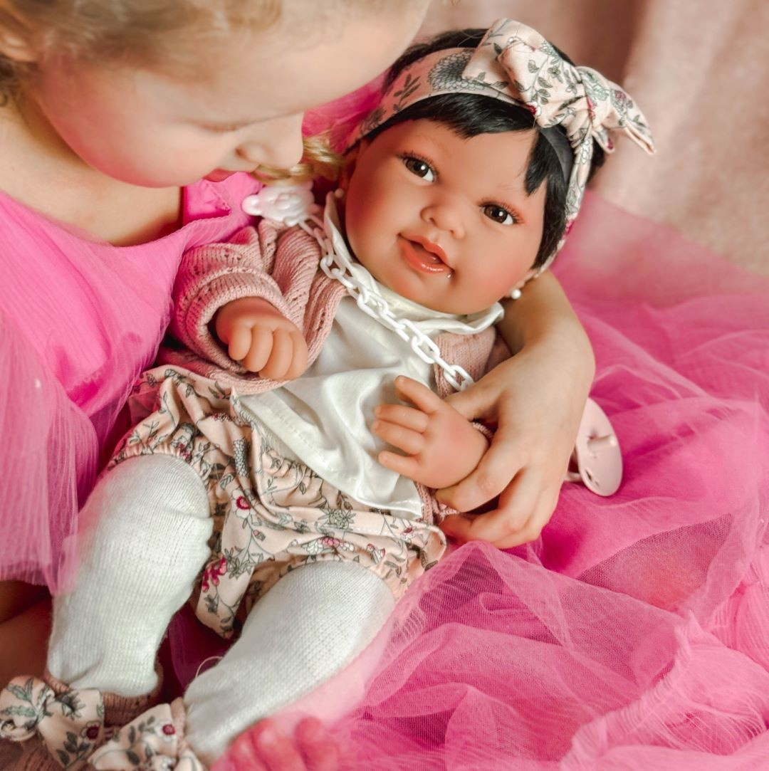 Dziewczynka ma krótkie, ale gęste brązowe włoski ozdobione opaską z kokardką, które bez problemu można czesać. Duże, piwne oczy lalki zostały namalowane ręcznie, co sprawia, że spojrzenie przypomina te prawdziwe i widać w nim głębie. Oczka otoczone gęstymi rzęsami nie zamykają się, dlatego osiągnięty efekt jest jeszcze bardziej widoczny i przykuwa wzrok. Dziewczynka ma również kolczyki w uszach, które są włożone na stałe (nie można ich wyjąć ani wymienić). Dodatkowo lalka ma ruchome rączki, nóżki i głowę, dzięki czemu może przybierać różne pozycje. Aby, zobaczyć jak lala samodzielnie siedzi, wystarczy delikatnie przegiąć jej nogi.