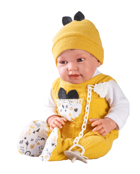 Urodę dzidziusia podkreśli modna stylizacja. Chłopiec ma na sobie ładny kombinezon w kolorze musztardowym i wsuwaną czapkę z czarnymi uszami. Całą stylizację wykańcza pasiasta poduszka zwieńczona pluszowymi pomponami. Przyjemna w dotyku podusia pozwoli otulić chłopca do snu. Dodatek sprawdzi się także jako wypełnienie wózka czy kołyski. Wszystkie ciuszki łączą się ze sobą kolorem i wzorem, co sprawia, że w całości zestaw prezentuje się doskonale. Ciuszki można zdjąć i przebierać chłopca bez końca. Natomiast kiedy Pipo jest śpiący możesz włożyć smoczek, a on wtedy spokojnie będzie leżakował na podusi. Dzięki funkcjonalności nasza pociecha nabiera wprawy przy przebieraniu i uczy się codziennych obowiązków, które nie raz na początku mogą sprawiać trudności.