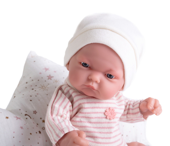 Hiszpański bobas ma duże niebieskie oczy, zaś na główce nie posiada włosków, jedynie występują rzeźbienia imitujące delikatne włoski, które wyglądem przypominają jak u prawdziwego noworodka. Bobas jest niewielki, dlatego sprawdzi się na wszelkie wyjścia oraz przyjęcia do rodziny czy wyjazd wakacyjny. Słodkie maleństwo od dziś będzie towarzyszyć gdziekolwiek pójdziesz. W asortymencie lalek Antonio jest wiele różnych Pitusów ile jest prawdziwych dzieci, więc znajdziesz odpowiedni model dla siebie w pięknych stylizacjach oraz uroczymi dodatkami.