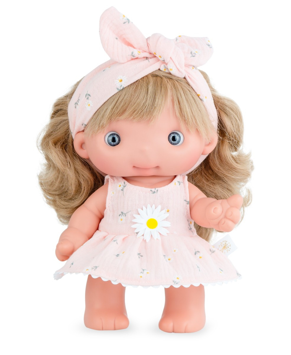 Urocze 25-centymertowe lalki hiszpańskie z kolekcji Piu to wyjątkowa propozycja od firmy Marina & Pau. Oryginalnie zaprojektowany model 1417 został wykonany z miękkiego, przyjemnego w dotyku winylu. Wyróżnia się uproszczoną mimiką twarzy oraz większą głową z gęstymi, kręconymi blond włosami. Zwracają uwagę niebieskie oczy, mały nosek i lekko uśmiechnięta buzia. Dziewczynka posiada wyraźnie zaznaczony pępek o kształcie guziczka. Głowa oraz kończyny są ruchome, dzięki czemu można ułożyć ją w dowolnej pozycji.