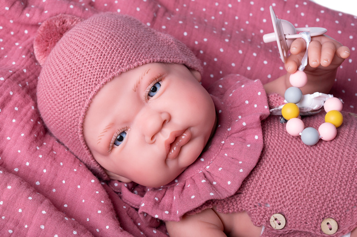 Słodki noworodek ma na sobie krótki, różowy kombinezon i wsuwaną czapkę z pomponem. Ubrano wykonano z dzianiny i ozdobiono kołnierzykiem w białe groszki. Dodatkowo Parejitę wyposażono w mięciutki kocyk w groszki, którym można ją utulić do snu czy przytulić. Poza tym nosi pieluchę jak prawdziwe dziecko. Nie brakuje mu szczegółów w akcesoriach dlatego zawsze przy sobie ma smoczek z zawieszką. Całą stylizację dziewczynki uszyto z wysokiej jakości tkanin. Wraz z Rebornem dostarczany jest certyfikat autentyczności z unikalną numeracją, która gwarantuje jego wyłączność jako Reborn od Antonio Juan.