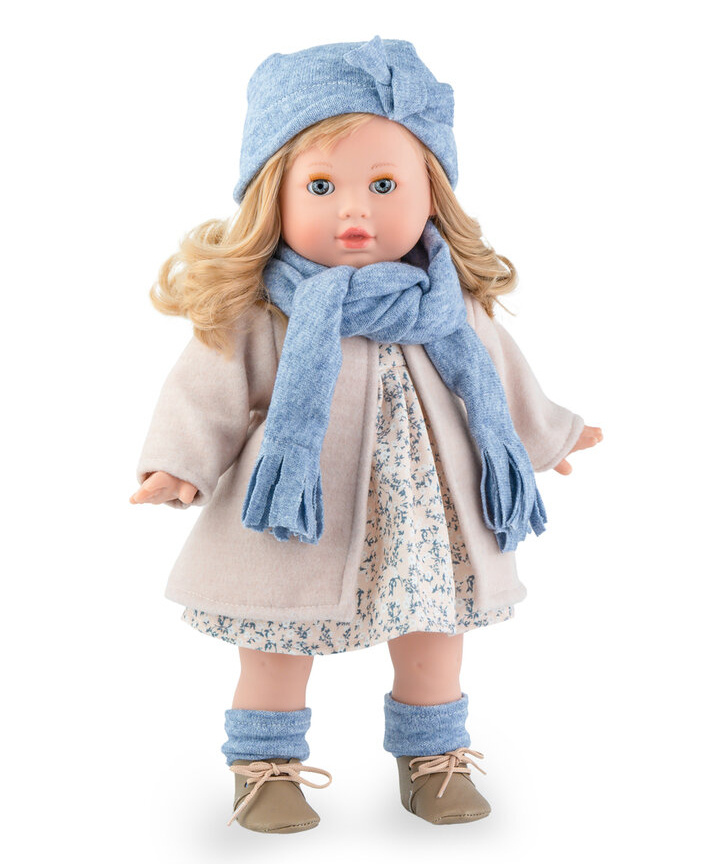 Dziewczynkę ubrano w pastelową stylizację. Tina ma na sobie morelową sukienkę zdobioną drobnymi kwiatuszkami oraz elegancki płaszczyk. Nóżki lali zdobią dłuższe, niebieskie wełniane skarpetki i wiązane brązowe buciki, a jej główkę otula przyjemna w dotyku materiałowa czapeczka. Wszystkie dodatki można zdjąć i ubierać na nowo lalę :)