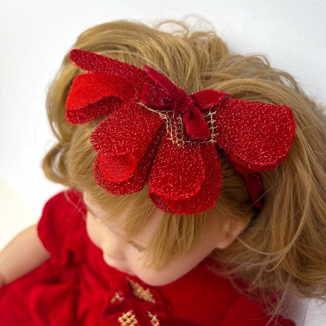 Elegancki strój sprawia, że dziewczynka wygląda jak typowo kolekcjonerska lalka. Ubrana jest w czerwoną sukienkę na krótki rękaw. Kreacja odcięta w talii podkreśla sylwetkę dziewczynki. Na dół ubranka przyszyto warstwę tiulu zdobioną pluszowymi czerwonymi pomponikami. Dopełnieniem modnego kompletu będą białe bufiaste spodenki i czerwone, skórzane buciki z delikatnym srebrnym zapięciem. Cały komplet ubraniowy idealnie pasuje do blondynki.