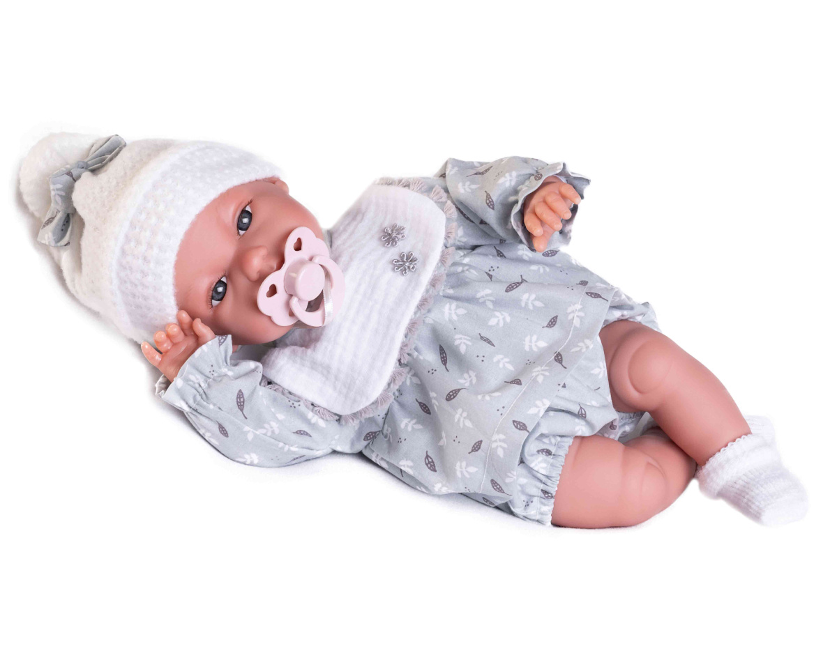 Toneta ma założony śliczny strój w listki. Komplet składa się z eleganckiej sukienki na długi rękaw i krótkich bufiastych spodenek. Do kreacji przyszyto biały śliniaczek obszyty szarą lamówką. Ponadto strój uzupełniają białe skarpetki oraz czapeczka ozdobiona kokardą. Jeśli Toneta jest zmęczona i chce odpocząć, załóż jej smoczek i przytul ją w ramionach. Cały komplet został wykonany z wysokiej jakości tkanin, aby zapewnić komfort zabawy.