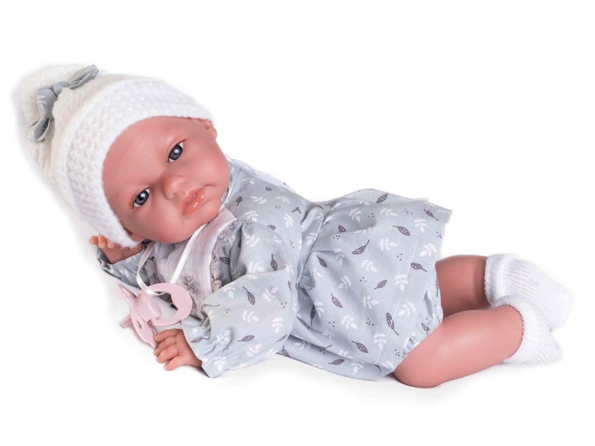 Lalka Recien Nacida Baby Toneta 70359 to kolejny słodki bobas z kolekcji lalek hiszpańskich. Jest to autentycznie odwzorowany bobas, który wyglądem przypomina prawdziwe niemowlę. Dziewczynka ma 34 cm wysokości i waży 408 g. Lalka o imieniu Toneta ma duże niebieskie oczy, które zostały otoczone długimi rzęsami, zaś jej brwi stanowią jedynie tylko zarys. Na główce laleczki zostały wyrzeźbione włoski przypominając niemowlęce. Laleczkę o niewielkich rozmiarach można wszędzie ze sobą zabrać.