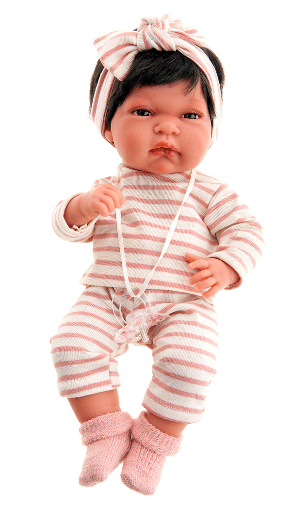Bobas ma na sobie śliczny elegancki komplet. Producent wyposażył zestaw w spodenki oraz bluzeczkę. Cały ciuszek jest w białym kolorze, a jego dekorację stanowi wzór w różowe paseczki. Uzupełnienie stanowią cieplutkie różowe skarpetki wykonane z delikatnego materiału, który jest przyjemny w dotyku. Również warto też wspomnieć o okryciu, niezbędnym elemencie podczas spacerów, więc różowa kołderka przyda się jako wysłanie łóżeczka czy wózka. Kołderka jest dwustronna, warstwa zewnętrzna jest mięciutka i białym kolorze z kolei druga jej część jest różowa i została ozdobiona drobnym wzorem w kropeczki oraz gwiazdki. Dodatkową atrakcję zapewni dołączony do laleczki smoczek, który został zawieszony na tasiemce. Za sprawą zawieszki młoda dama będzie miała przy sobie dane akcesorium.