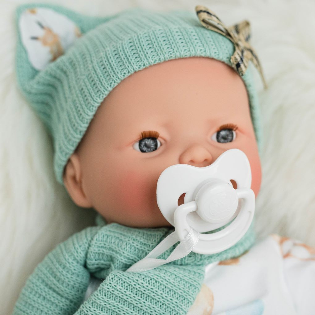 Idealne do zabawy w odgrywanie roli troskliwej opiekunki, lalki hiszpańskie z serii Pitus zachwycają ręcznie malowanymi niebieskimi oczami, opatrzonymi wianuszkiem rzęs. Lśniące otwarte usteczka oraz rumieńce na policzkach dodają twarzy pogodnego wyrazu. Na główce wyrzeźbione włosy, które wyglądają jak niemowlęce. Maluszki płaczą po wyjęciu smoczka jeśli zostanie wyjęte zabezpieczenie z mechanizmu, który znajduje się pod zapinaną na rzep bawełnianą osłoną plecków. Jeśli zabezpieczenie nie zostanie wyjęte, bobasy mogą spełniać funkcję ukochanych lalek do przytulania.