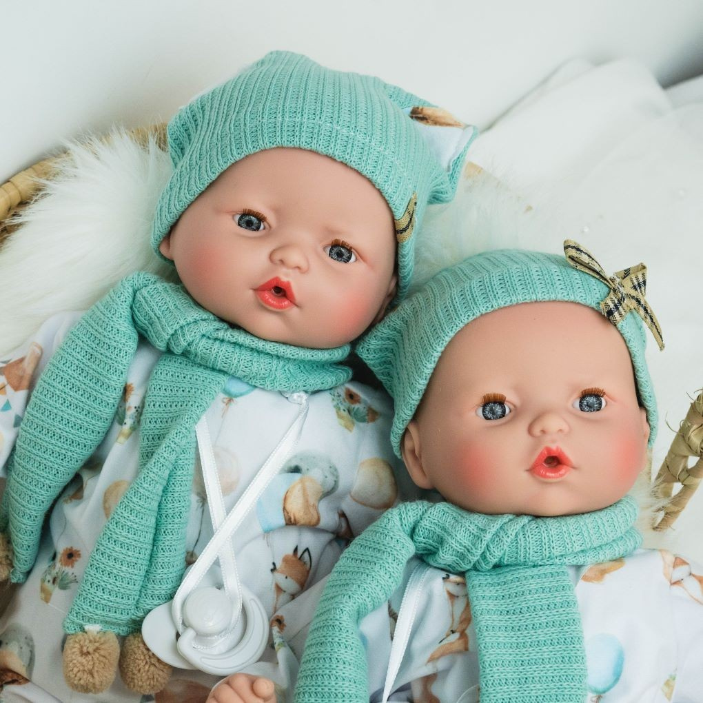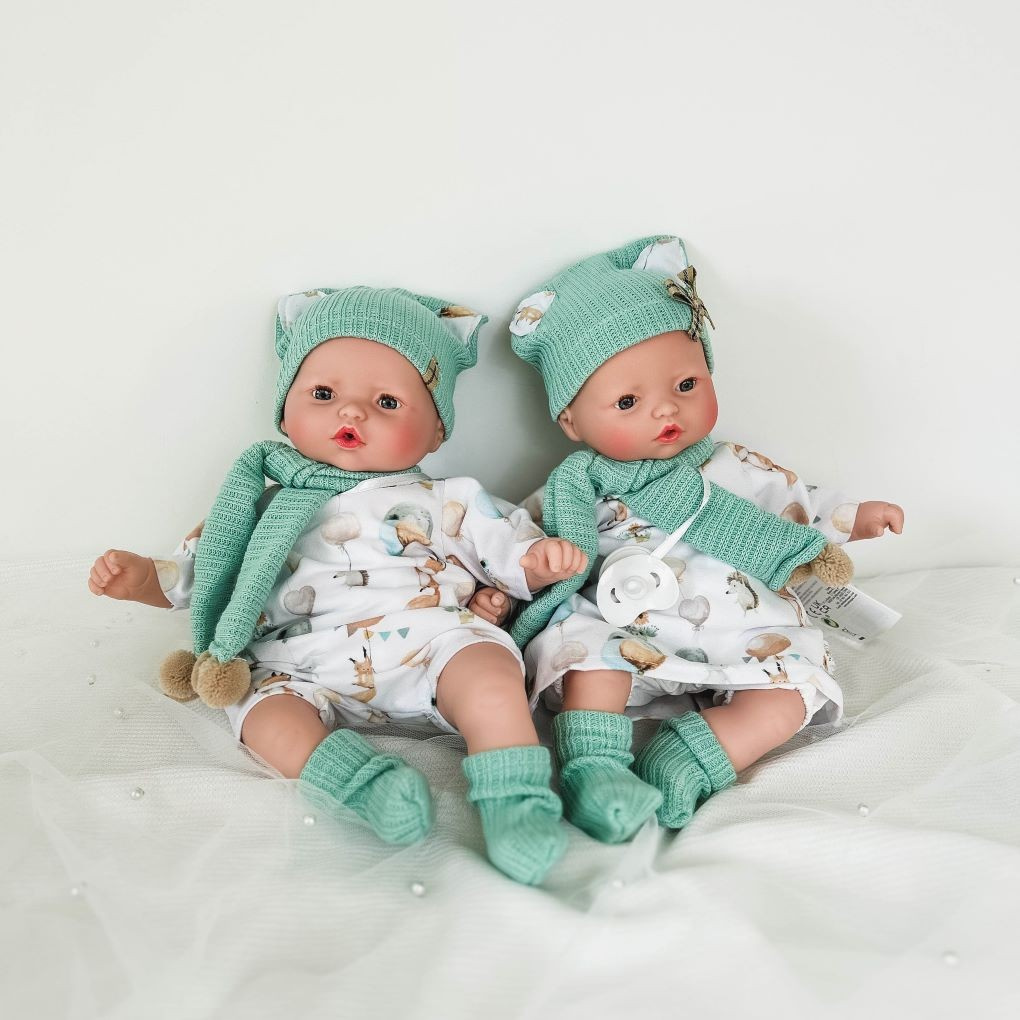 Modnie ubrana para 42-centymetrowych bliźniaków to jedyna w swoim rodzaju propozycja od producenta lalek hiszpańskich - Marina &Pau. Są to modele interaktywne - po wyjęciu smoczka magnetycznego bobasy płaczą. To wymarzona zabawka dla dzieci, które uwielbiają lalki przytulać, kołysać do snu i przebierać. Wykonane w całości w Hiszpanii lalki posiadają miękki brzuszek oraz głowę i kończyny wykonane z gładkiego, jasnego, ręcznie malowanego winylu. Ubrane są w dopracowane w każdym szczególe ręcznie szyte ubranka o delikatnej kolorystyce.