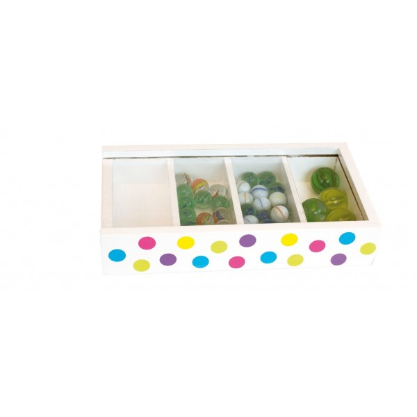 Magiczne, kolorowe pudełko z zestawem czterdziestu dwóch szklanych kulek oraz woreczkiem do ich łatwego przechowywania. Błyszczące, tęczowe szklane kulki należą do najbardziej pożądanych skarbów dzieciństwa, nigdy się nie nudzą i nie znamy dziecka, które miało by ich zbyt wiele. Zapakowane w urocze drewniane pudełko idealnie nadają się na prezent. Wiek: 3+ Wymiary opakowania: 22 x 12 x 4cm  Jabadabado to szwedzka firma istniejąca na rynku od 1993 roku specjalizująca się w projektowaniu i produkcji zabawek drewnianych, elementów wyposażenia pokoi dziecięcych. Wszystkie produkty Jabadabado cechuje oryginalny design, piękna kolorystyka i niezwykle staranne wykonanie. Wszystkie zabawki marki Jabadabado stworzone są z myślą o dzieciach i pobudzają do kreatywnej zabawy.