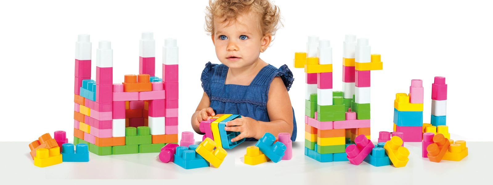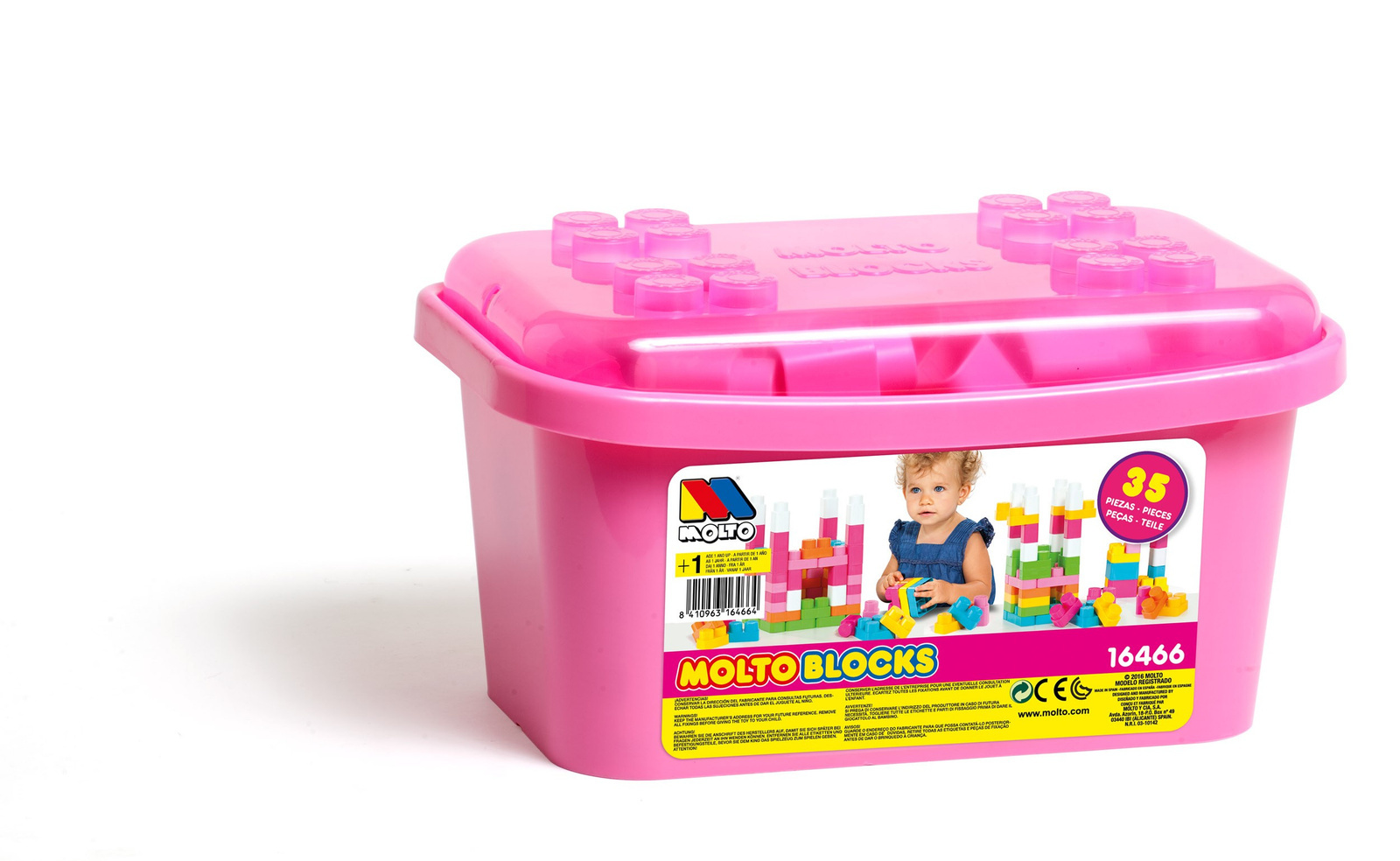 Pudełko z klockami zawierająca 35 klocków w różnych kształtach.