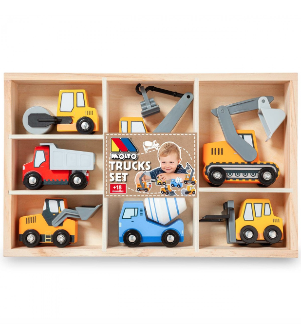Drewniany zestaw składający się z 7 zabawkowych pojazdów budowlanych, w tym dźwigu, walca, betoniarki, wózka widłowego, koparki, wywrotki i koparki. Możesz bawić się w budowanie swoich pierwszych konstrukcji na plaży, na wsi lub gdziekolwiek chcesz! Doskonały zestaw do koordynacji ręka-oko i kształtowania umiejętności motorycznych, a także rozwijania wyobraźni. Nasze drewniane zabawki są wykonane zgodnie z FSC, z wybranych zrównoważonych materiałów i przy użyciu przyjaznego dla środowiska procesu produkcyjnego. Drewniane zabawki Molto Nature są ręcznie malowane nietoksycznymi farbami na bazie wody i spełniają najsurowsze normy bezpieczeństwa.