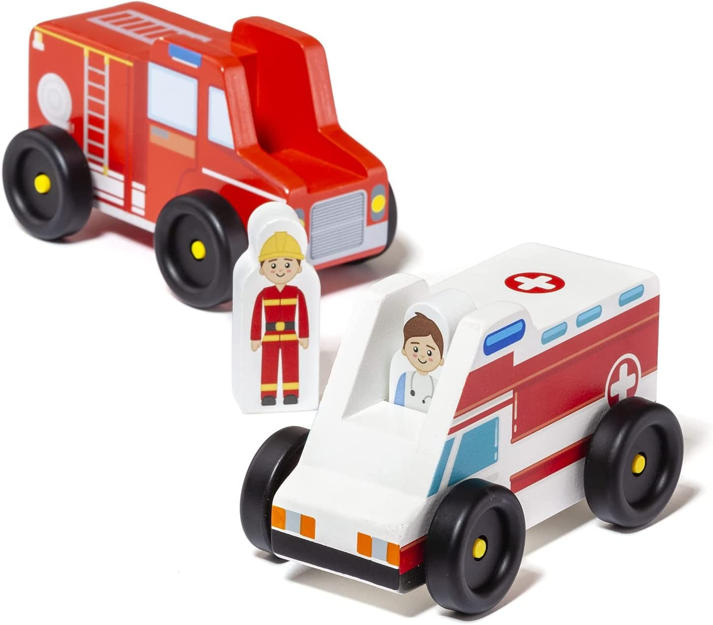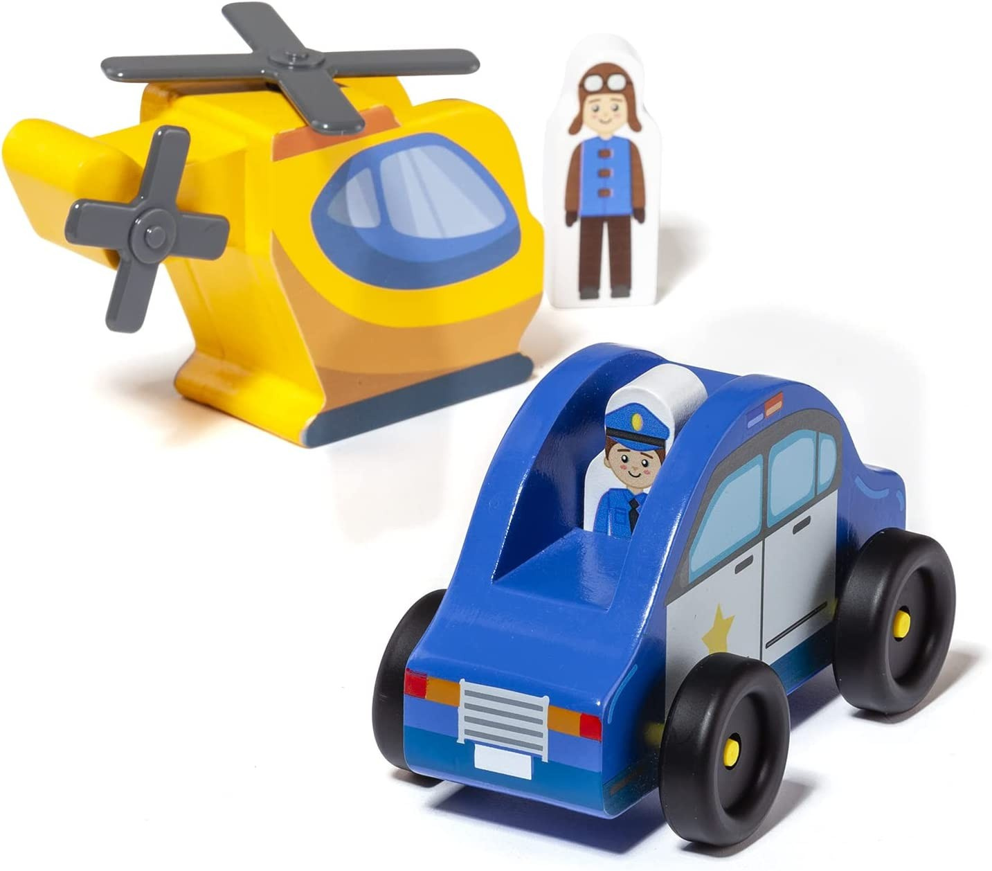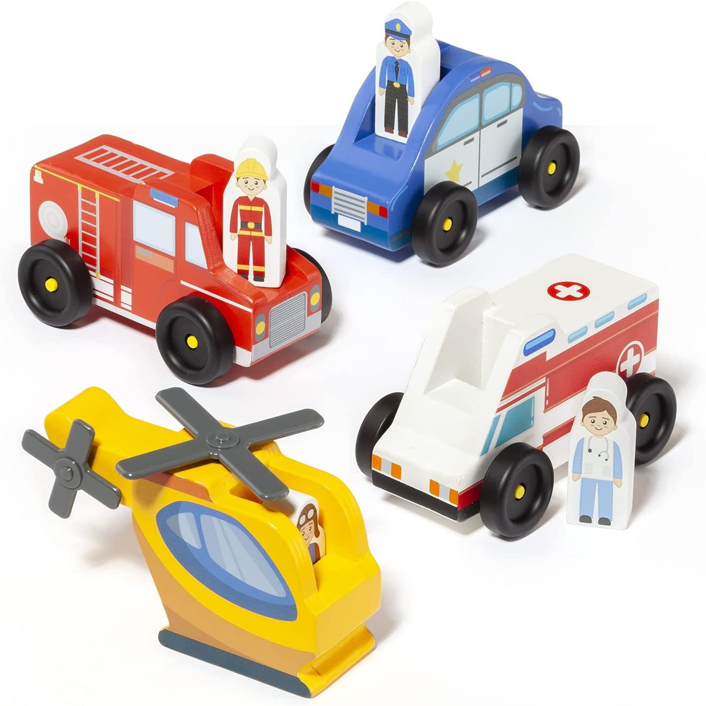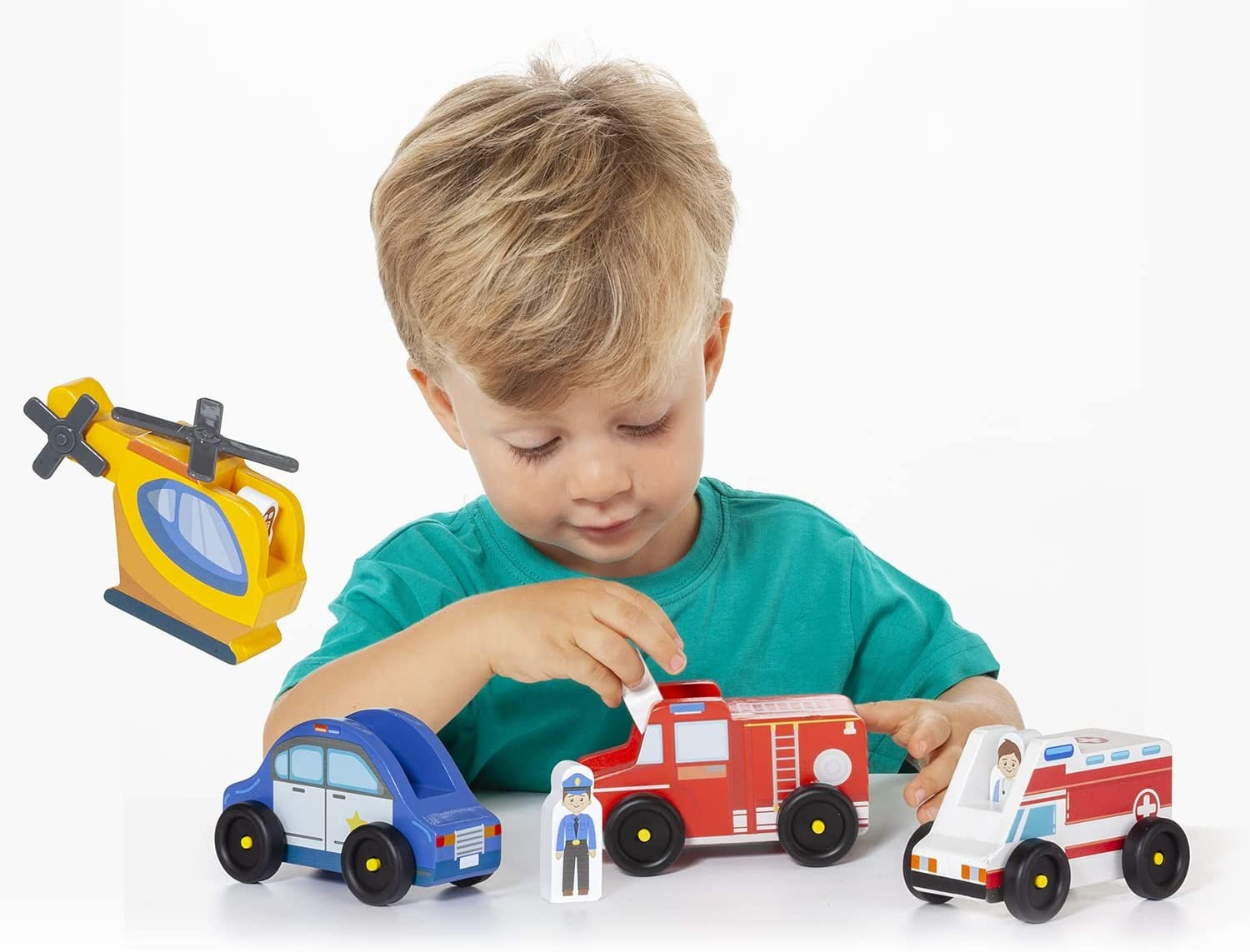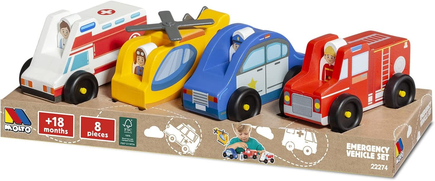 Zestaw 4 drewnianych zabawkowych pojazdów ratowniczych: helikopter ratunkowy, wóz strażacki, karetka pogotowia i samochód policyjny. Oraz 4 postacie: strażak, lekarz, policjant i ratownik. Postacie mieszczą się w fotelach kierowcy, a koła i śmigło helikoptera obracają się. Doskonały zestaw do koordynacji ręka-oko i kształtowania umiejętności motorycznych, a także rozwijania wyobraźni. Nasze drewniane zabawki są wykonane z wyselekcjonowanych, zrównoważonych materiałów zgodnych z FSC oraz w przyjaznym dla środowiska procesie produkcyjnym. Drewniane zabawki Molto Nature są ręcznie malowane nietoksycznymi farbami na bazie wody i spełniają najsurowsze normy bezpieczeństwa.