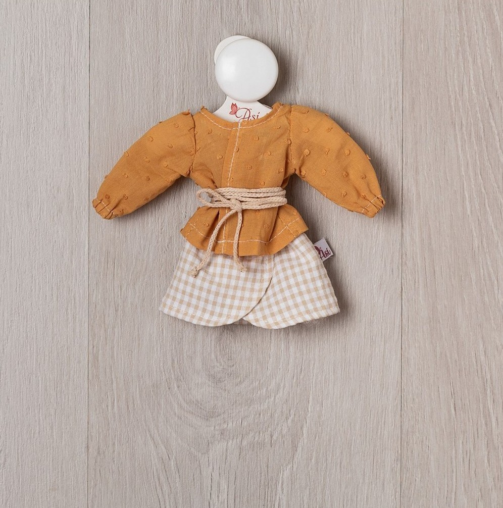 Każdą zabawę lalkami uatrakcyjnia wysokiej jakości, ręcznie szyty, unikalny outfit. Miodową, miękką w dotyku bluzkę na zakładkę z długimi, szerokimi rękawami, wykończono ściągaczem. Mini spódniczkę zdobi delikatny wzór w ponadczasową kratkę. Szyku dodaje szeroki pasek, wiązany na kokardkę. Strój perfekcyjnie leży na 30-cm. lalkach "przyjaciółkach z serii ASI Celia. Uatrakcyjnia zabawę w projektantkę mody.