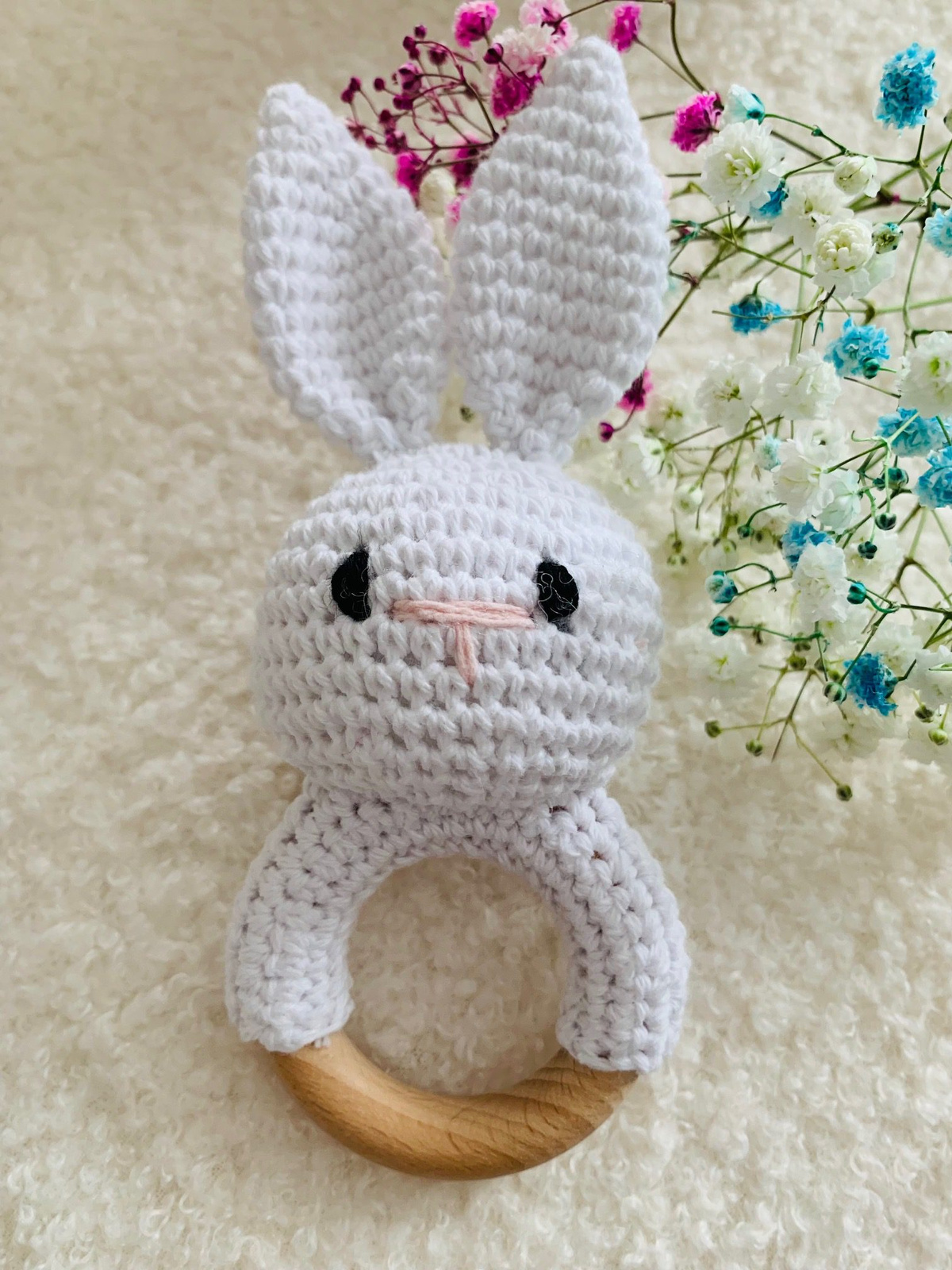 Urocza grzechotka Królik i gryzak w jednym, wykonana ręcznie na szydełku. Idealna na prezent dla maleństwa. Produkt zapakowany jest w ekologiczne pudełko prezentowe. Rozwija koordynację wzrokowo - ruchową. Podczas zabawy rozwija zdolności manualne dziecka. Umieszczona w mięciutkim króliczku delikatna grzechotka wyciszy maluszka i zachęci do zabawy. Idealny jako pierwsza zabawka dla Twojego maluszka. Gładkie wykończenia i różne struktury materiałów zapewnią doznania sensoryczne. Wykonany z przyjemnych i delikatnych kolorów. Jest w 100% naturalny i nietoksyczny. Wiek: 0+ Wymiary: 15 x 6,5 cm Pielęgnacja: